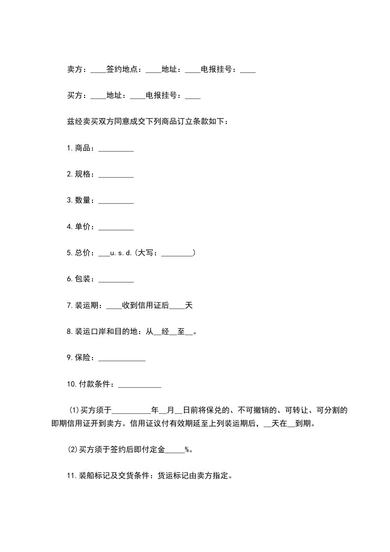 11.装船标记及交货条件:货运标记由卖方指定。