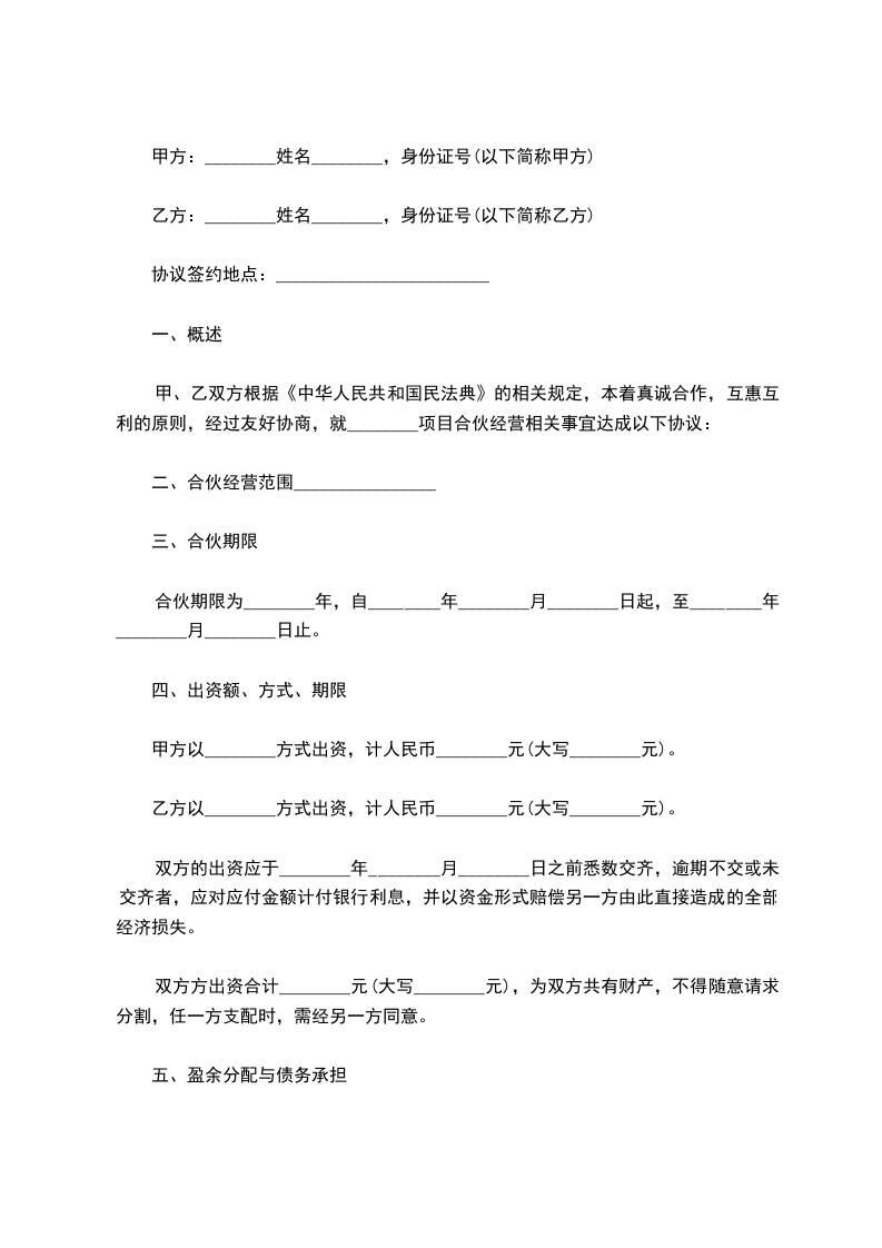 甲、乙双方根据《中华人民共和国民法典》的相关规定,本着真诚合作,互惠互利的原则,经过友好协商,就________项目合伙经营相关事宜达成以下协议: