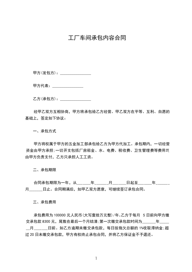 合同承包期限为一年,从_______年_______月_______日起至_______年_______月_______日止。合同期满后,如甲乙双方愿意,可继续签订承包合同。