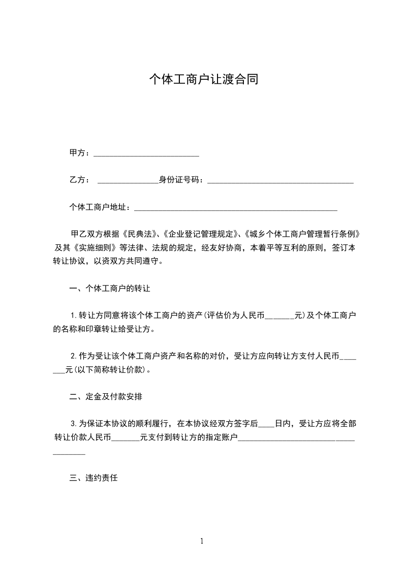 1.转让方同意将该个体工商户的资产(评估价为人民币_______元)及个体工商户的名称和印章转让给受让方。