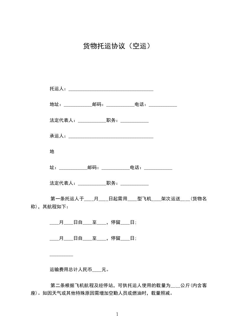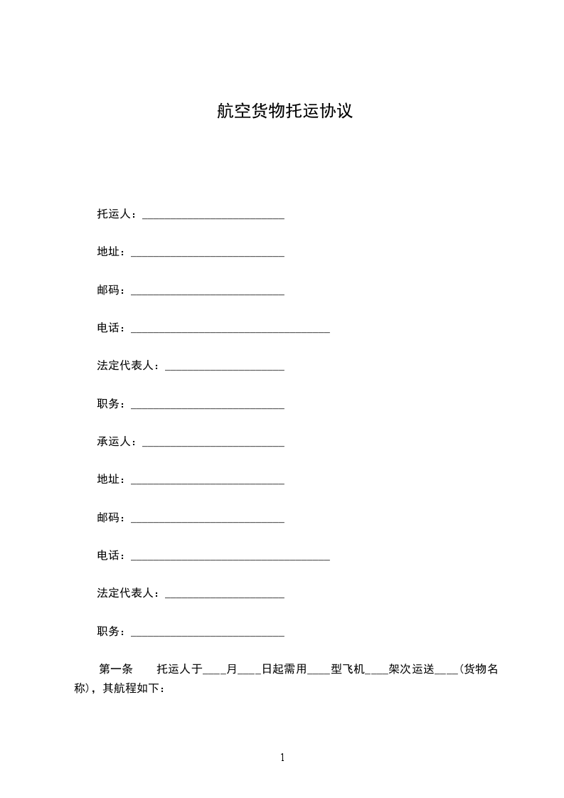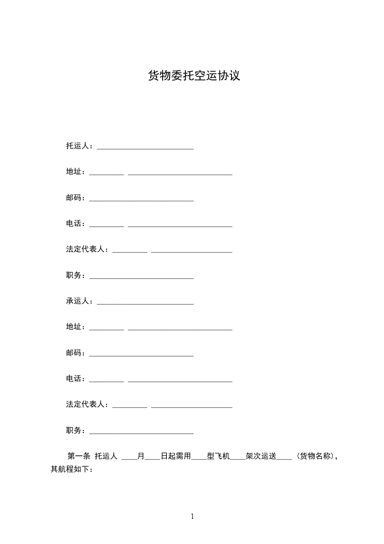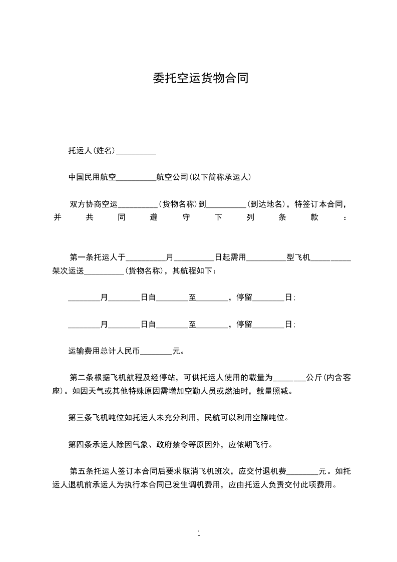 托运人(姓名)_________与中国民用航空_________航空公司(以下简称承运人)协商空运)__________________(货物名称)到__________________(到达地名),特签订本合同,并共同遵守下列条款:
