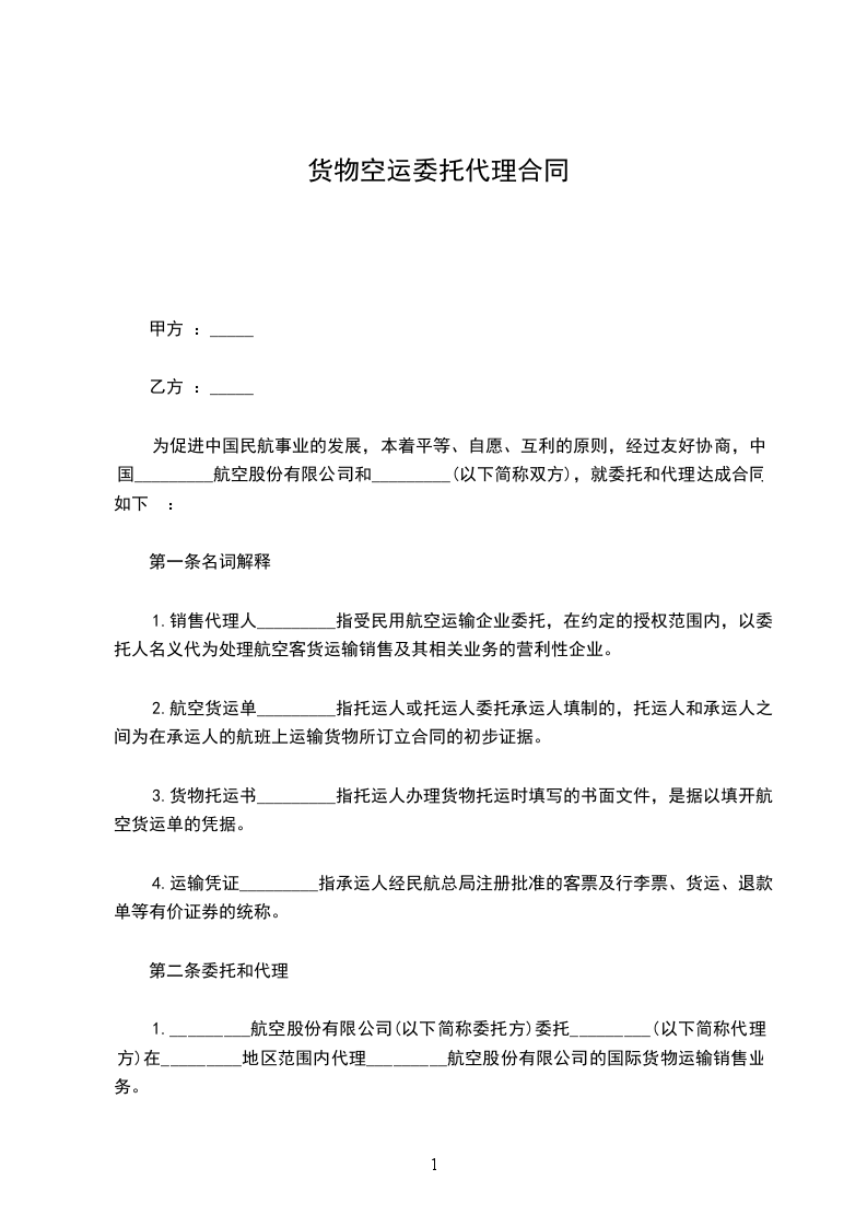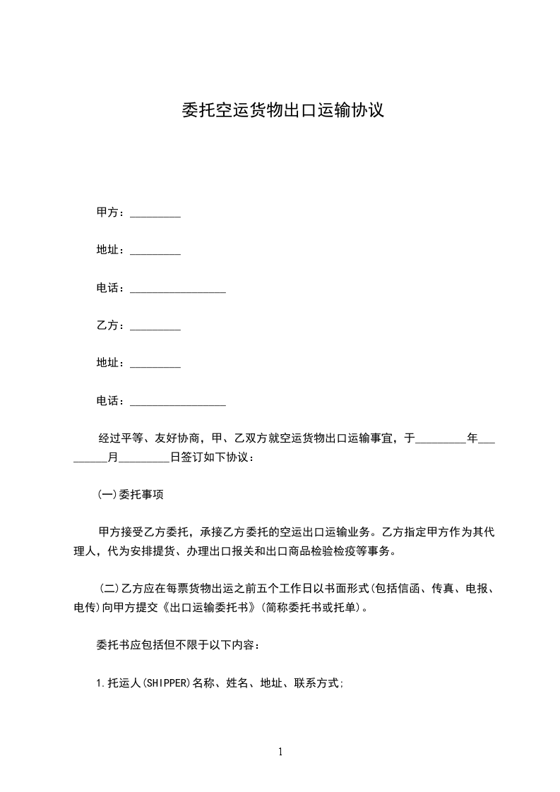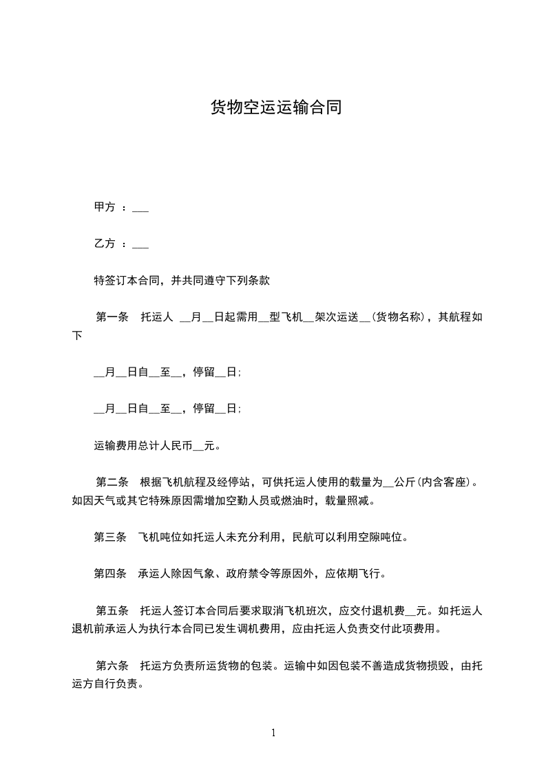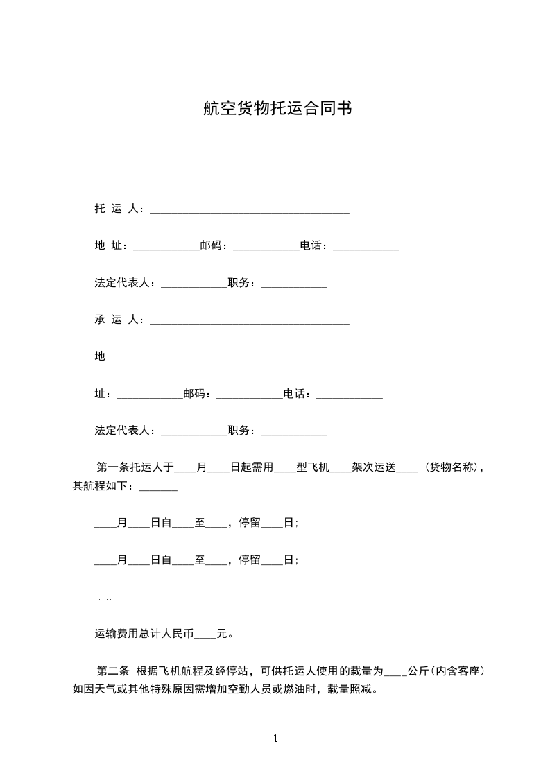 托运人(姓名)_________与中国民用航空_________航空公司(以下简称承运人)协商空运)__________________(货物名称)到__________________(到达地名),特签订本合同,并共同遵守下列条款: