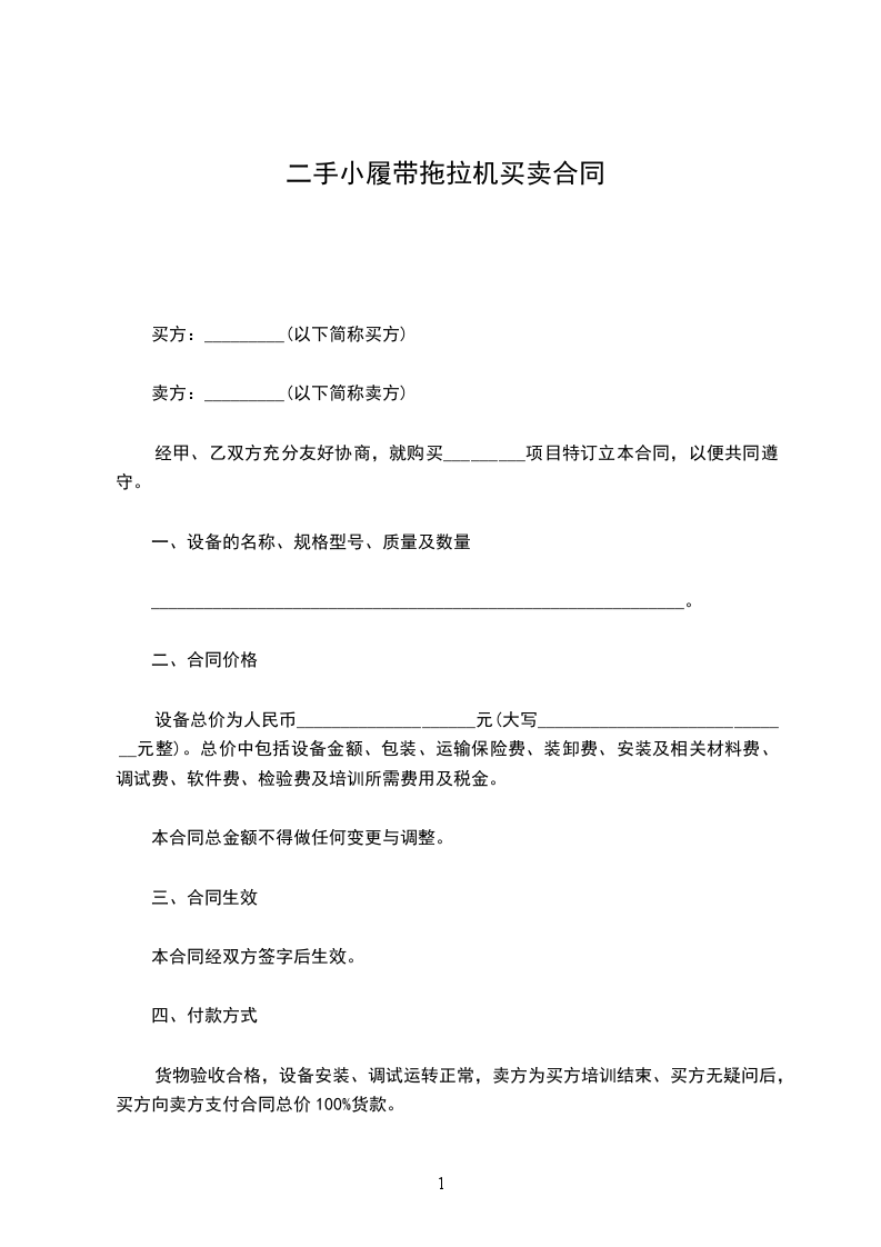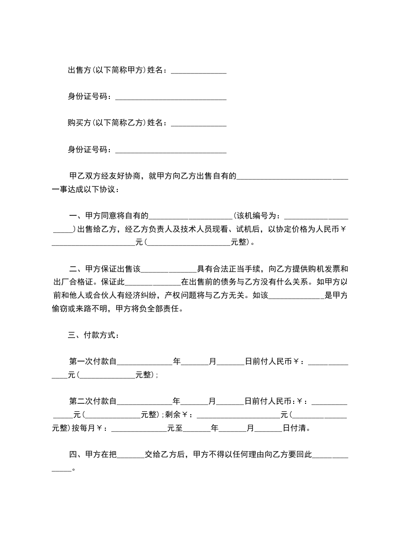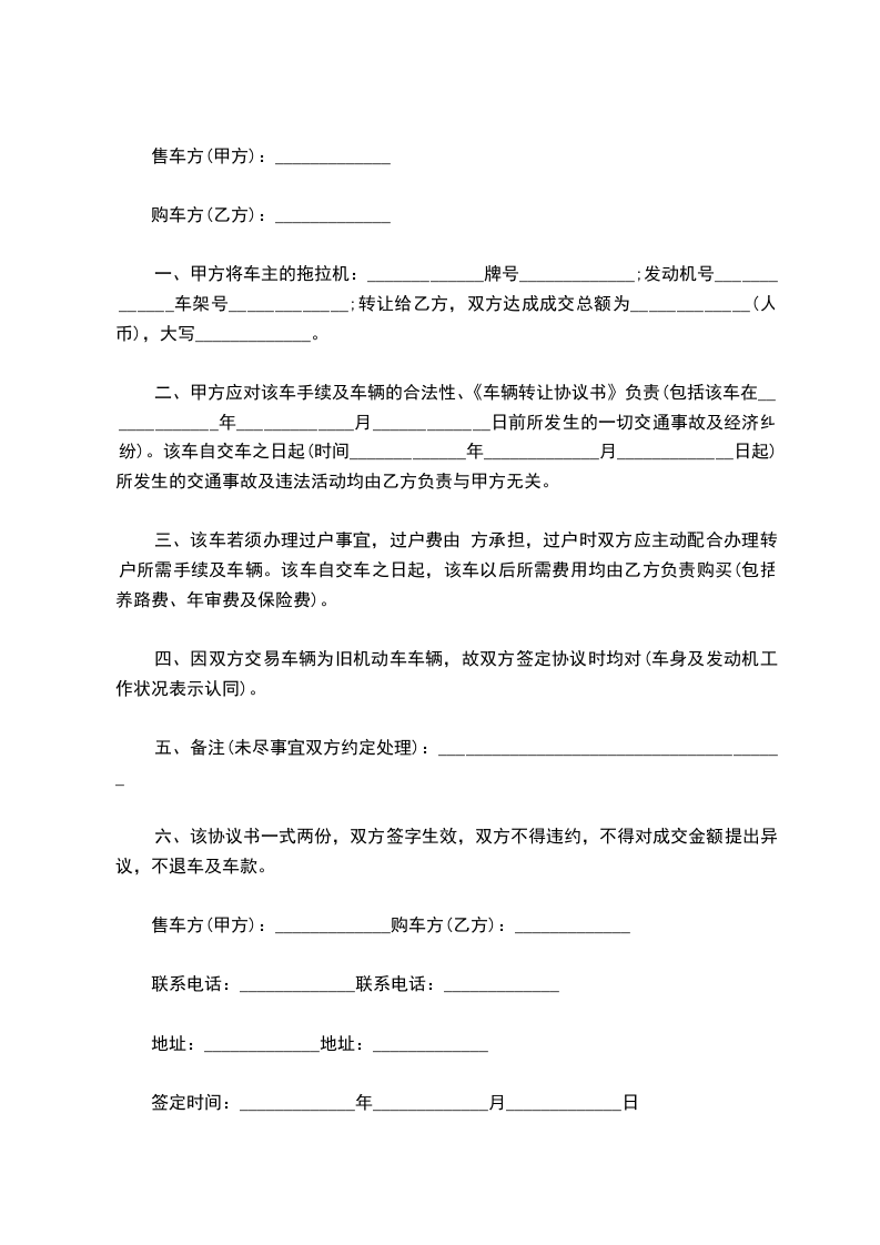 一、甲方将车主的拖拉机:_____________牌号_____________;发动机号_____________车架号_____________;转让给乙方,双方达成成交总额为_____________(人币),大写_____________。