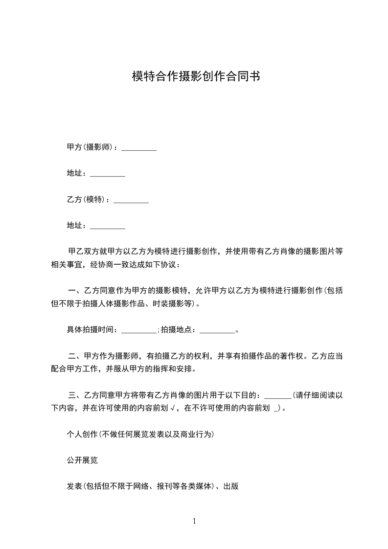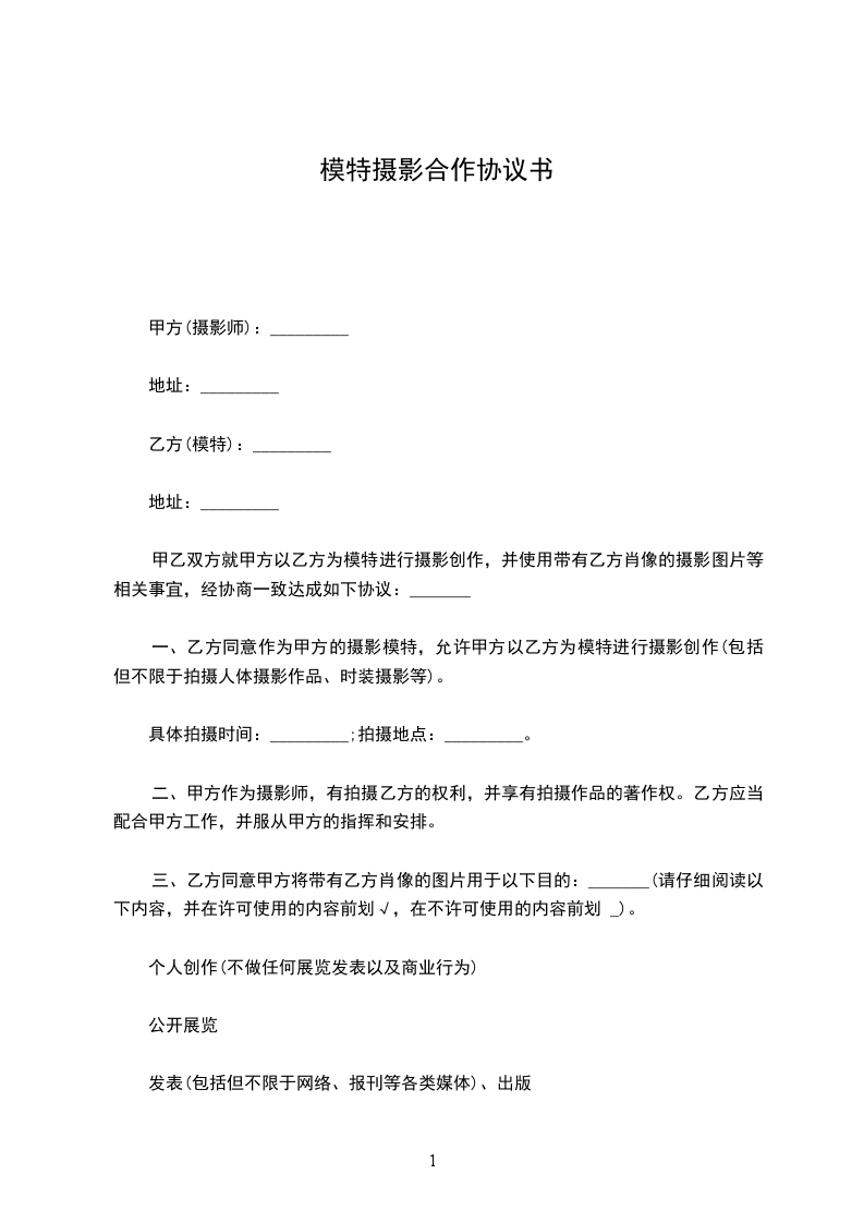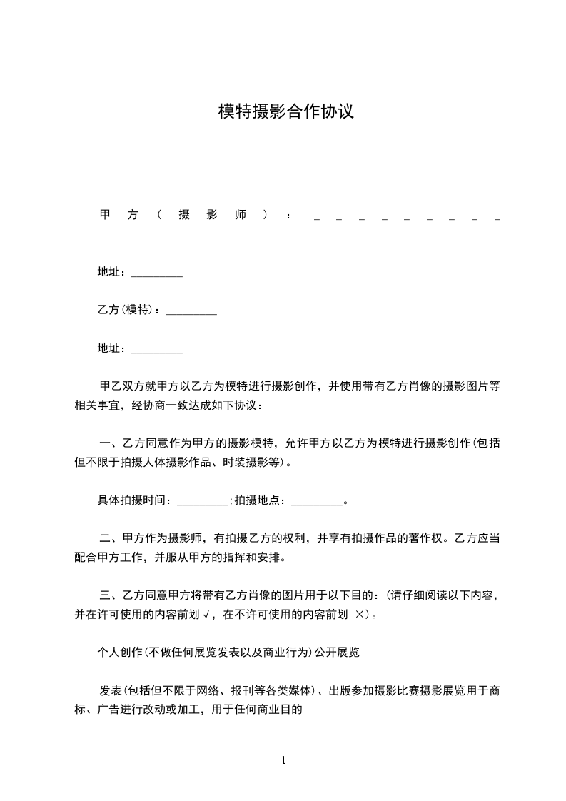 一、乙方同意作为甲方的摄影模特,允许甲方以乙方为模特进行摄影创作(包括但不限于拍摄人体摄影作品、时装摄影等)。