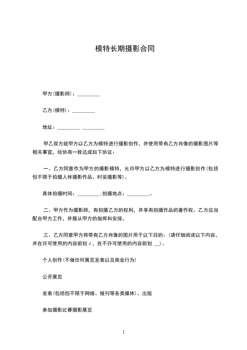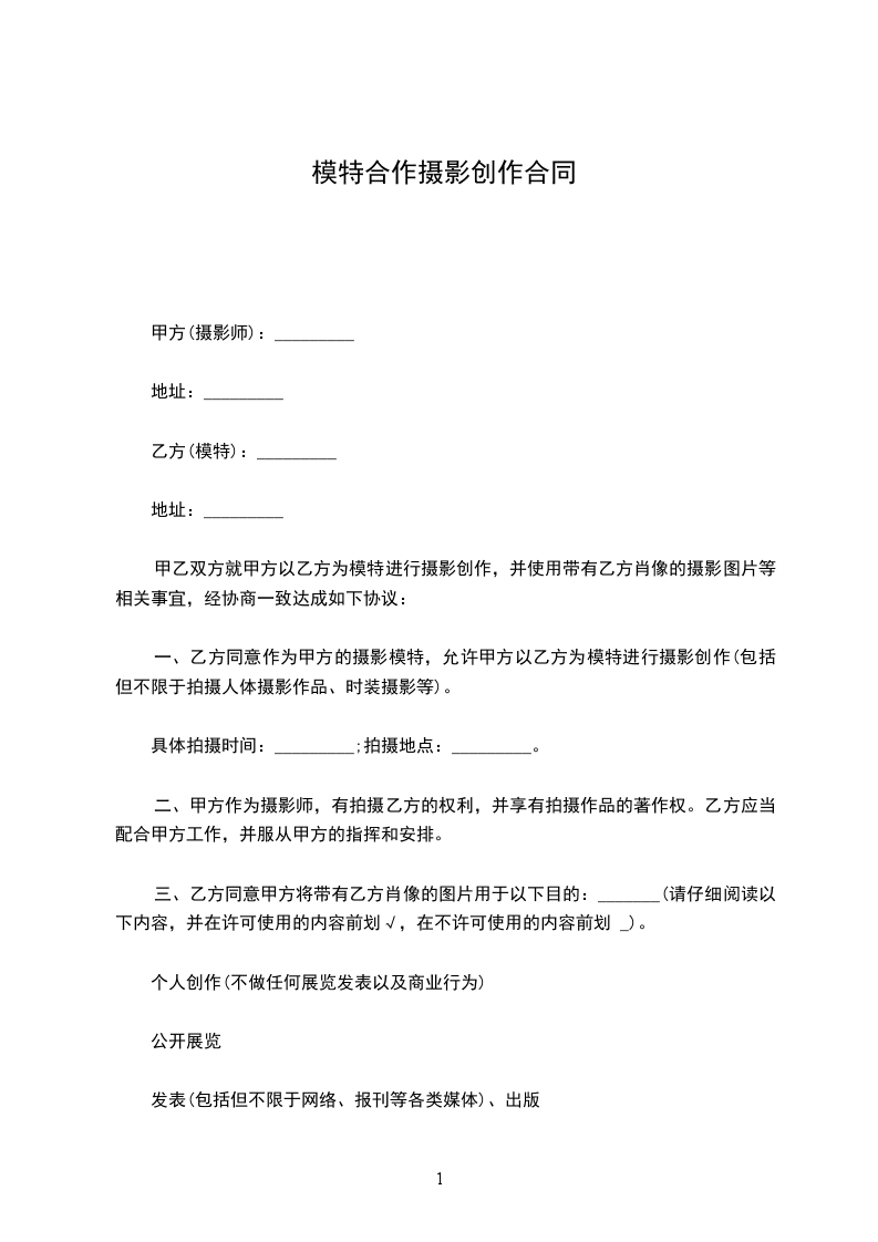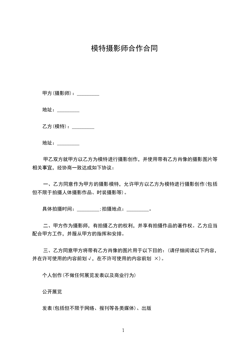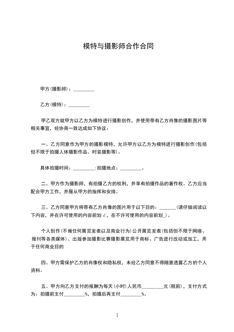 一、乙方同意作为甲方的摄影模特,允许甲方以乙方为模特进行摄影创作(包括但不限于拍摄人体摄影作品、时装摄影等)。