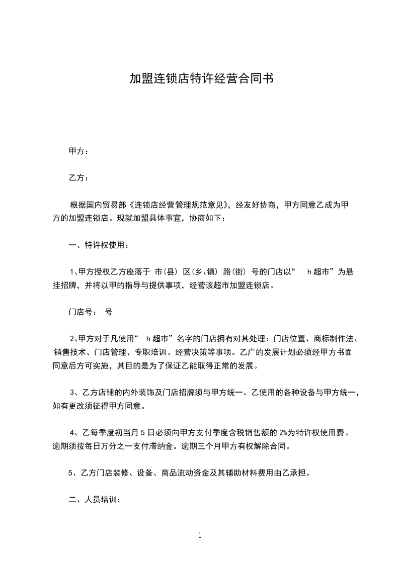 1、甲方授权乙方座落于 市(县) 区(乡、镇) 路(街) 号的门店以“h超市”为悬挂招牌,并将以甲的指导与提供事项,经营该超市加盟连锁店。