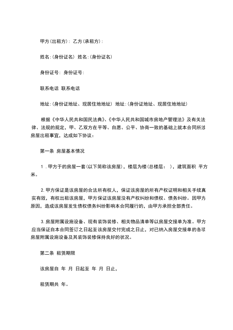 根据《中华人民共和国民法典》、《中华人民共和国城市房地产管理法》及有关法律、法规的规定,甲、乙双方在平等、自愿、公平、协商一致的基础上就本合同所涉房屋出租事宜,达成如下协议: