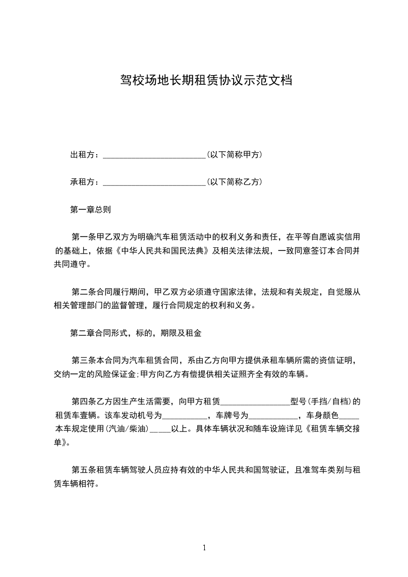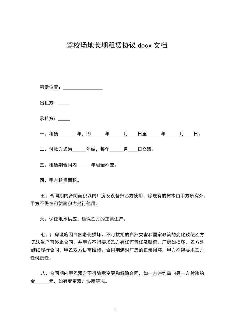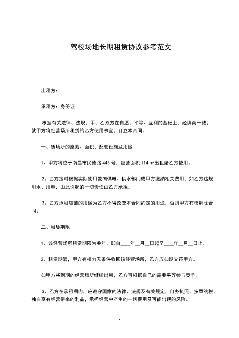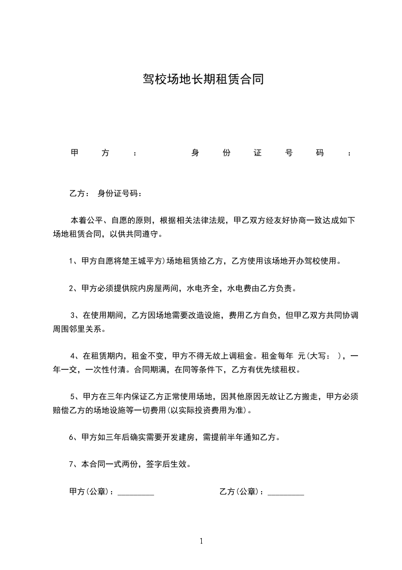 1、甲方自愿将楚王城平方)场地租赁给乙方,乙方使用该场地开办驾校使用。