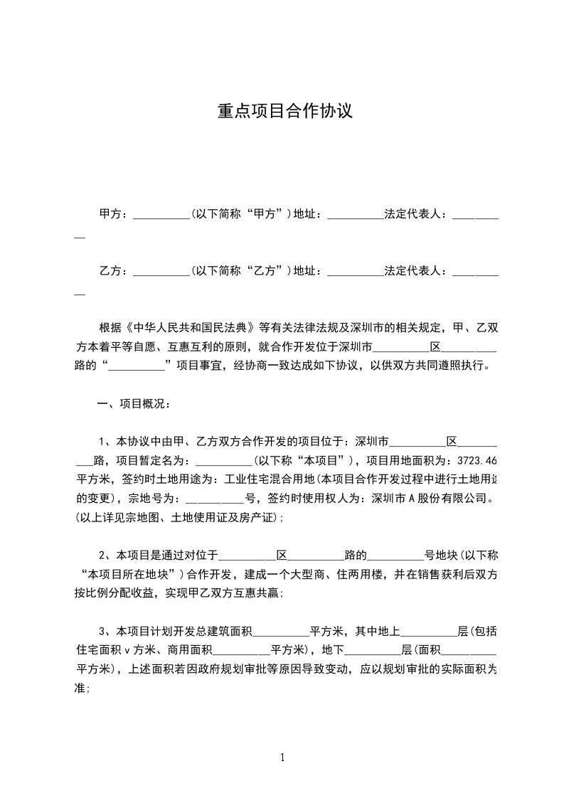 1、本协议中由甲、乙方双方合作开发的项目位于:深圳市__________区__________路,项目暂定名为:__________(以下称“本项目”),项目用地面积为:3723.46平方米,签约时土地用途为:工业住宅混合用地(本项目合作开发过程中进行土地用途的变更),宗地号为:__________号,签约时使用权人为:深圳市A股份有限公司。(以上详见宗地图、土地使用证及房产证);