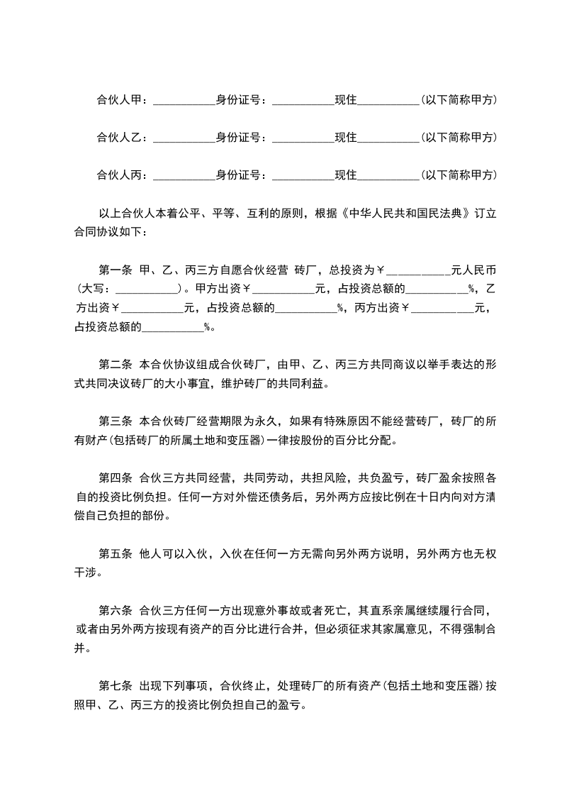 第一条 甲、乙、丙三方自愿合伙经营 砖厂,总投资为¥___________元人民币(大写:___________)。甲方出资¥___________元,占投资总额的___________%,乙方出资¥___________元,占投资总额的___________%,丙方出资¥___________元,占投资总额的___________%。
