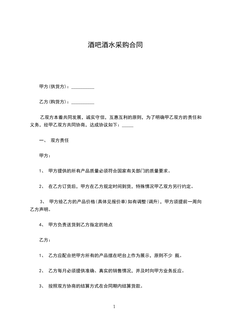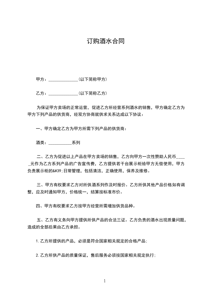 3.如发现酒水质量不合格或出现其他质量问题,乙方须向甲方作出市场价倍的补偿;