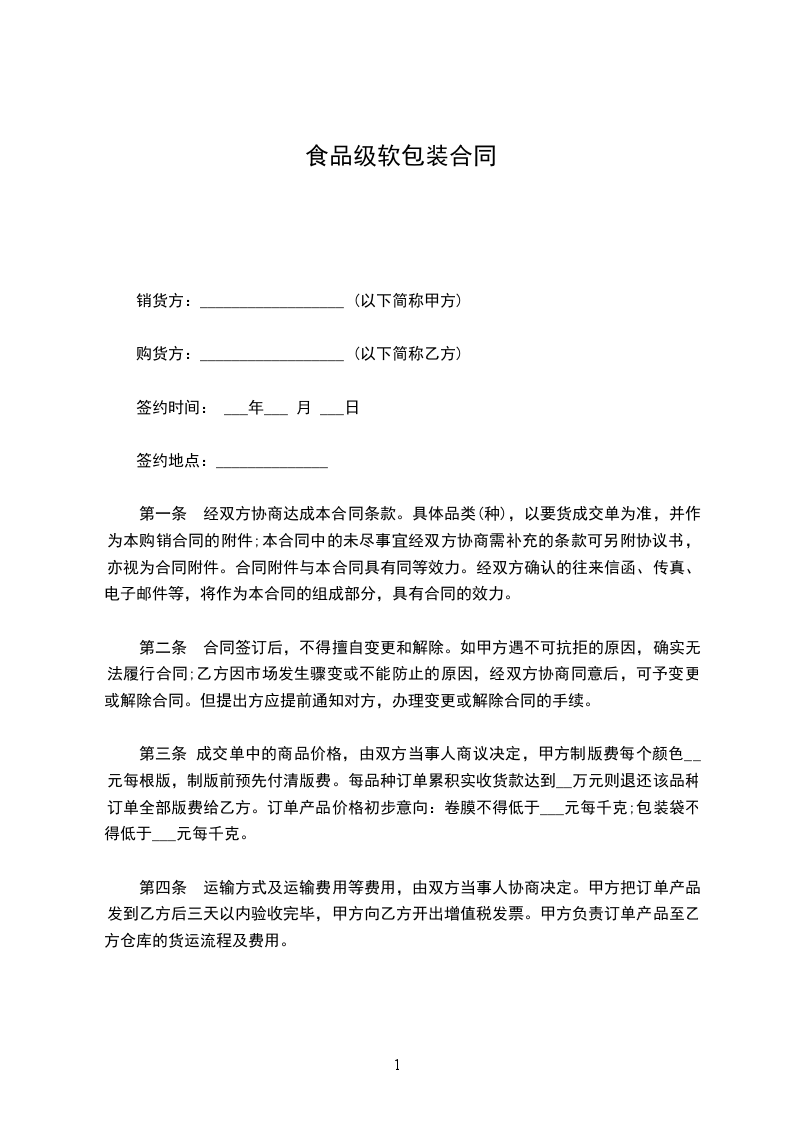 第三条 成交单中的商品价格,由双方当事人商议决定,甲方制版费每个颜色__元每根版,制版前预先付清版费。每品种订单累积实收货款达到__万元则退还该品种订单全部版费给乙方。订单产品价格初步意向:卷膜不得低于___元每千克;包装袋不得低于___元每千克。