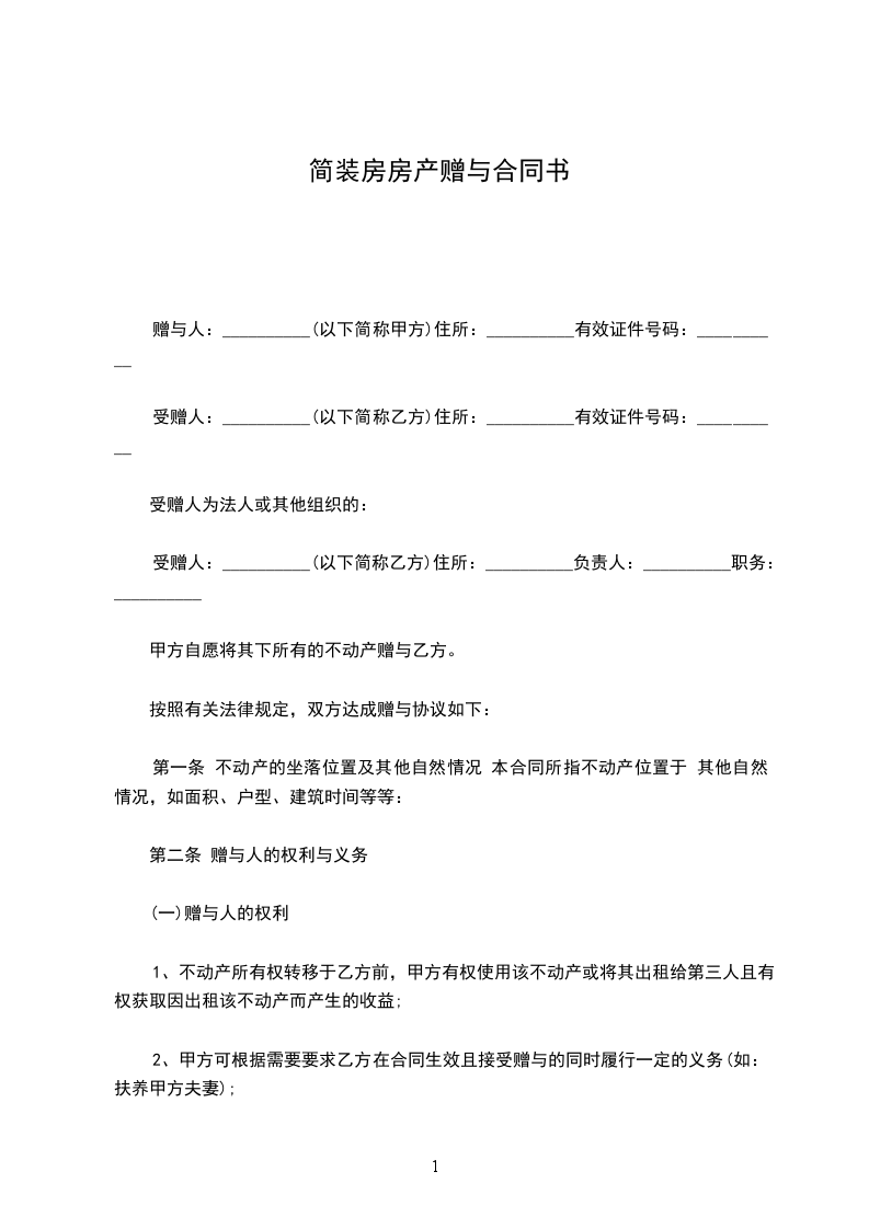 赠与人:__________(以下简称甲方)住所:__________有效证件号码:__________