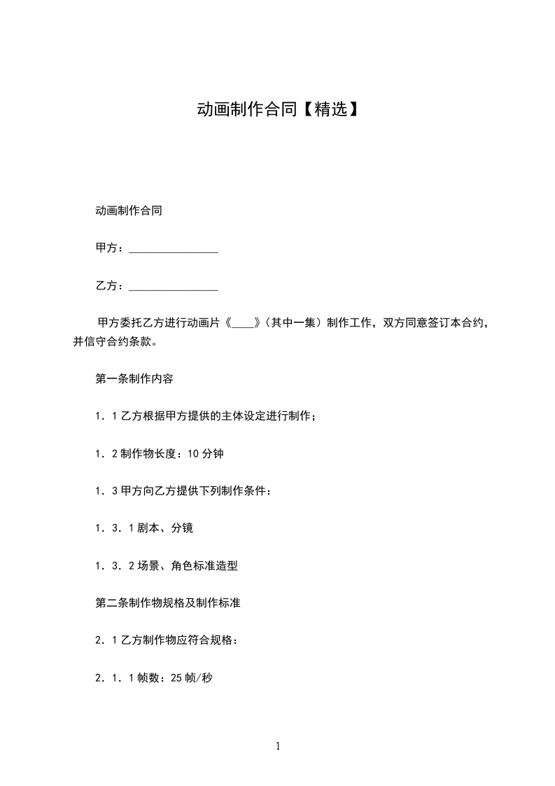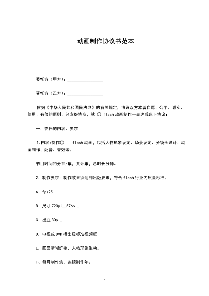 1、本合同签订后,乙方按照创意稿内容及合同所定内容周期完成模型、绑定、镜头追踪、动画及分层制作。于____年____月____日交付甲方动画预览,甲方负责验收。验收通过____日提供渲染成片,若有修改交片日期顺延。