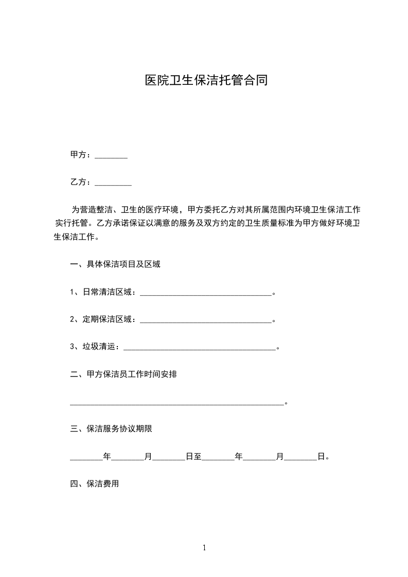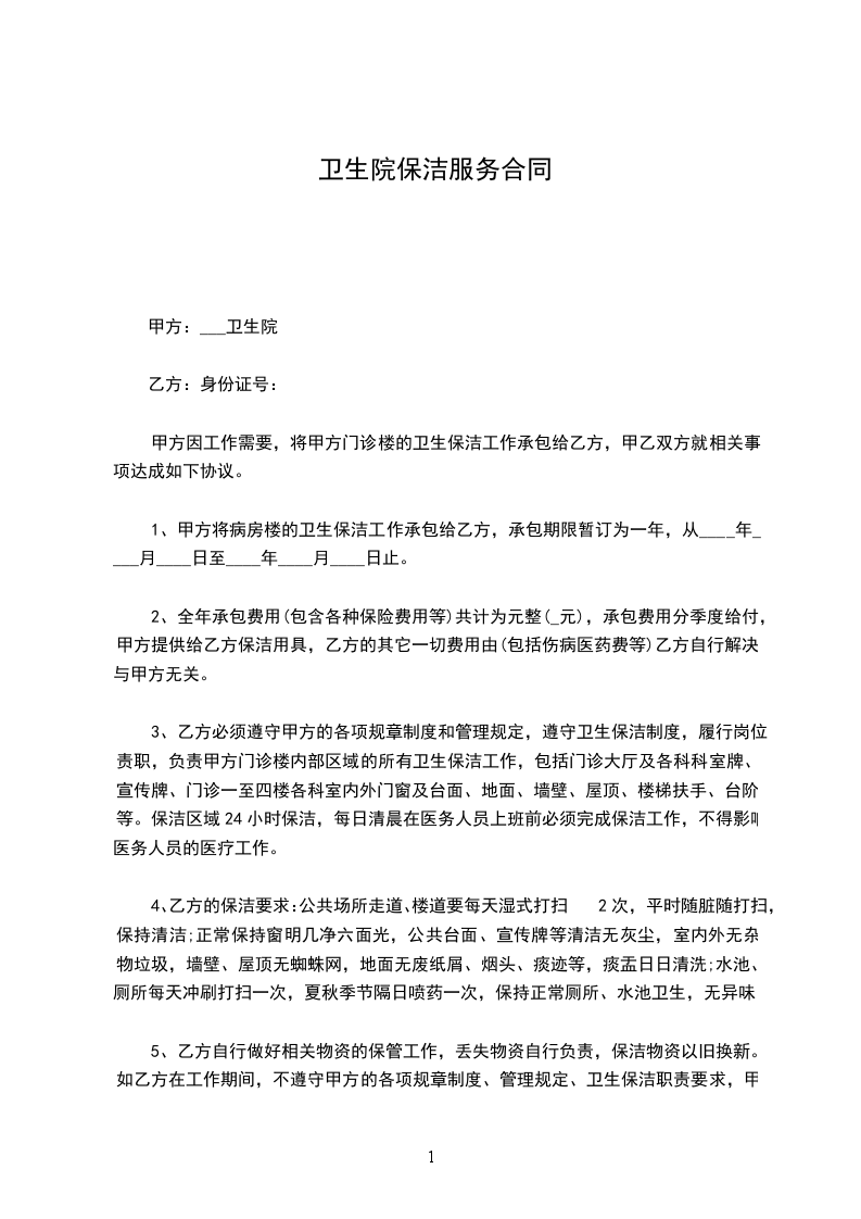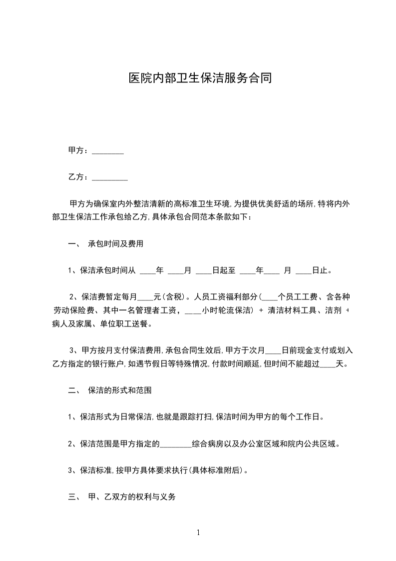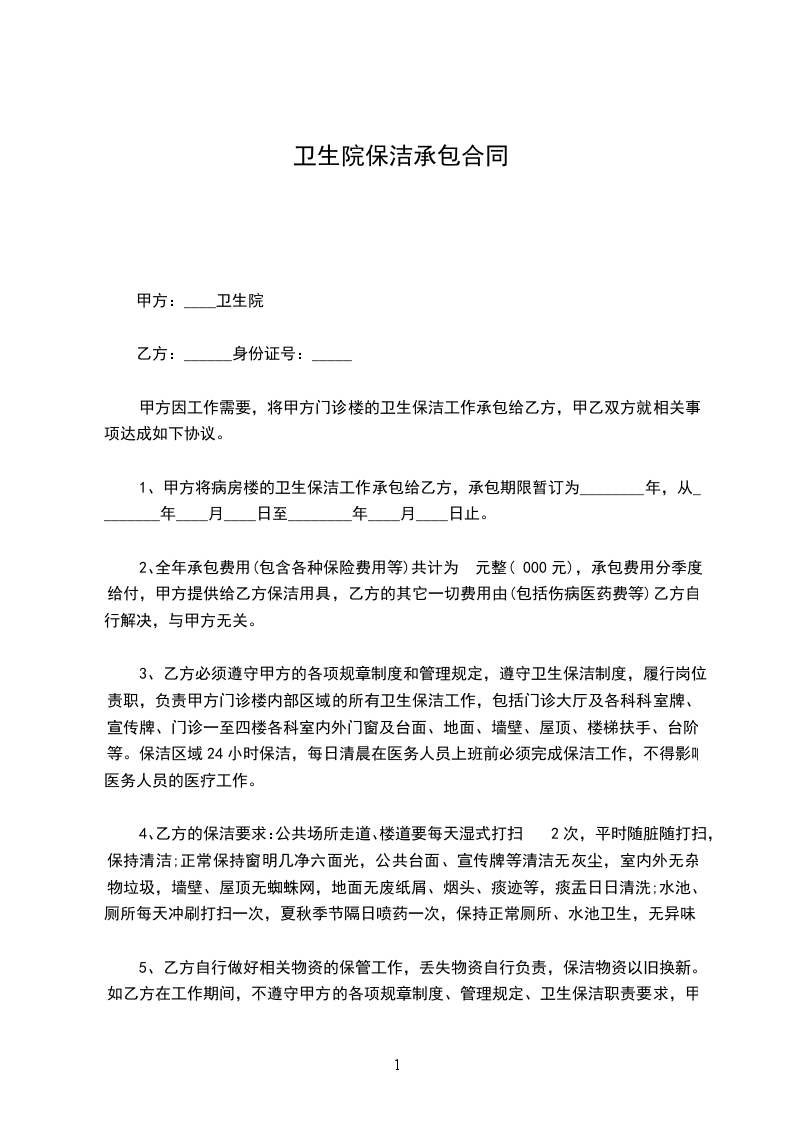 1、甲方将病房楼的卫生保洁工作承包给乙方,承包期限暂订为一年,从____年____月____日至____年____月____日止。