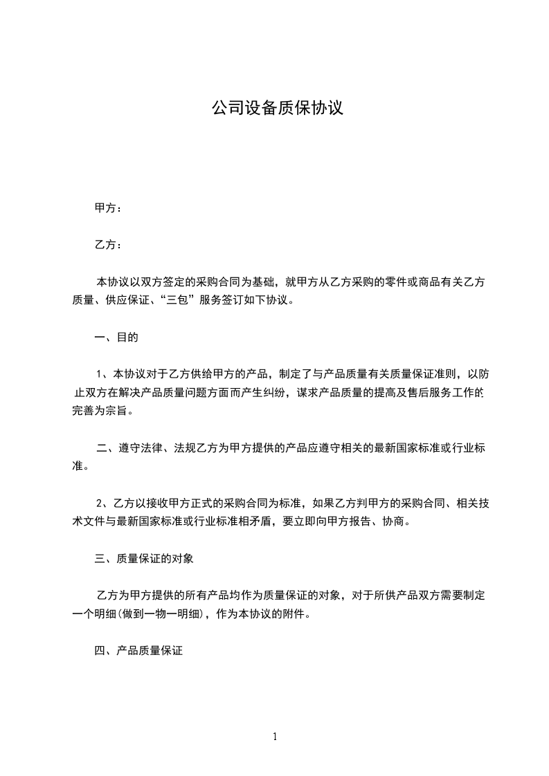 1、本协议对于乙方供给甲方的产品,制定了与产品质量有关质量保证准则,以防止双方在解决产品质量问题方面而产生纠纷,谋求产品质量的提高及售后服务工作的完善为宗旨。