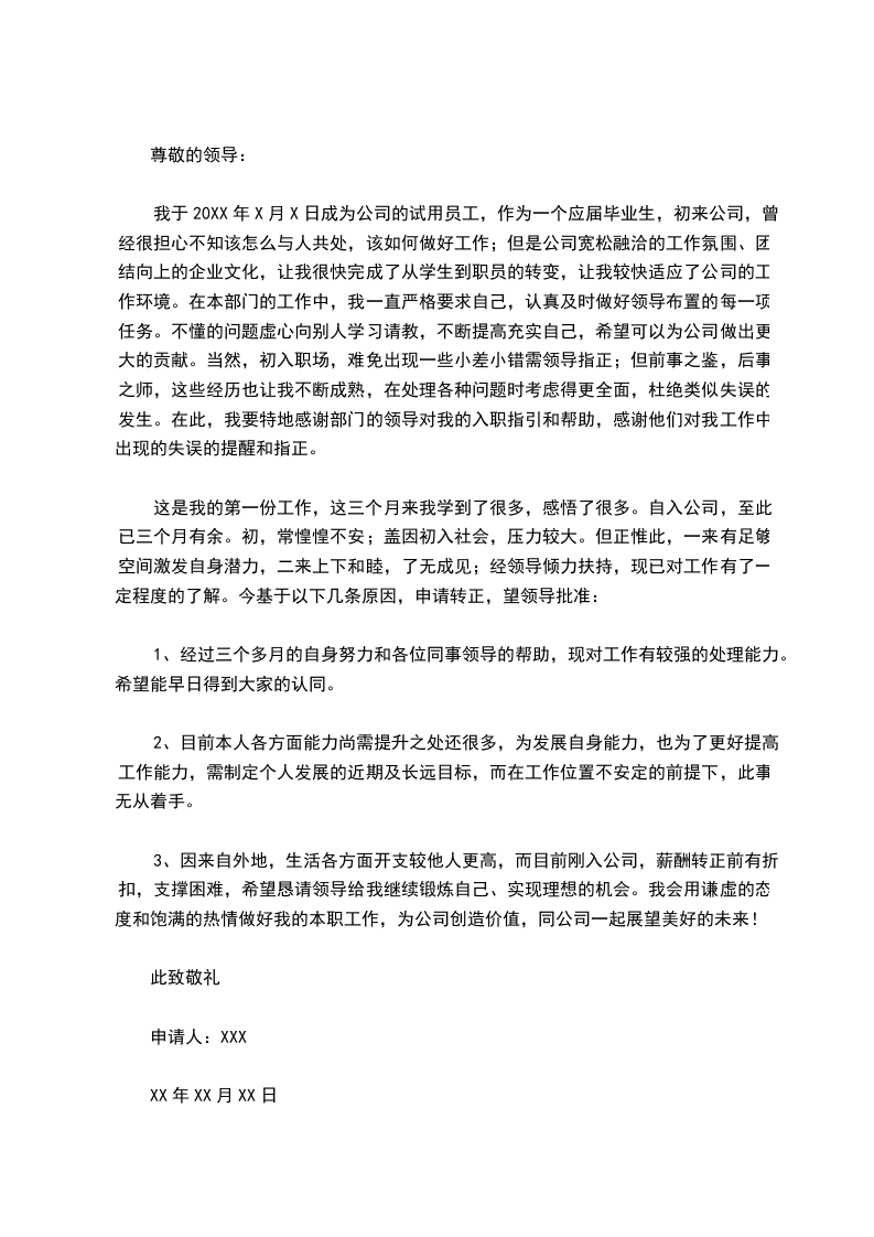我于20XX年X月X日成为公司的试用员工,作为一个应届毕业生,初来公司,曾经很担心不知该怎么与人共处,该如何做好工作;但是公司宽松融洽的工作氛围、团结向上的企业文化,让我很快完成了从学生到职员的转变,让我较快适应了公司的工作环境。在本部门的工作中,我一直严格要求自己,认真及时做好领导布置的每一项任务。不懂的问题虚心向别人学习请教,不断提高充实自己,希望可以为公司做出更大的贡献。当然,初入职场,难免出现一些小差小错需领导指正;但前事之鉴,后事之师,这些经历也让我不断成熟,在处理各种问题时考虑得更全面,杜绝类似失误的发生。在此,我要特地感谢部门的领导对我的入职指引和帮助,感谢他们对我工作中出现的失误的提醒和指正。