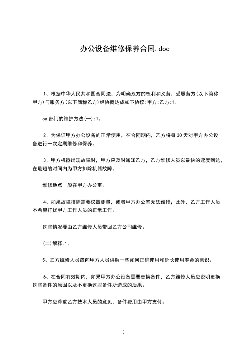 1. 为了保障甲方办公设备的正常使用,合同期间内,乙方定期为甲方的办公设备进行维修保养,定期 30 天保养一次。