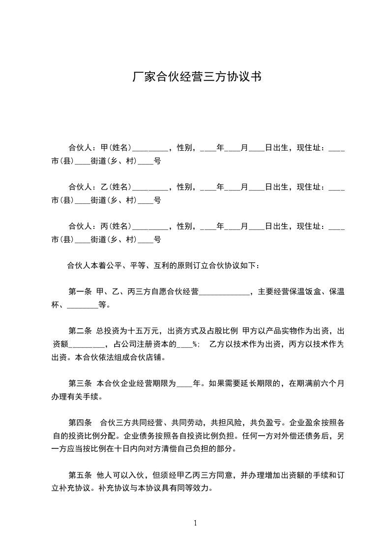 第一条 甲、乙、丙三方自愿合伙经营_____________,主要经营保温饭盒、保温杯、________等。