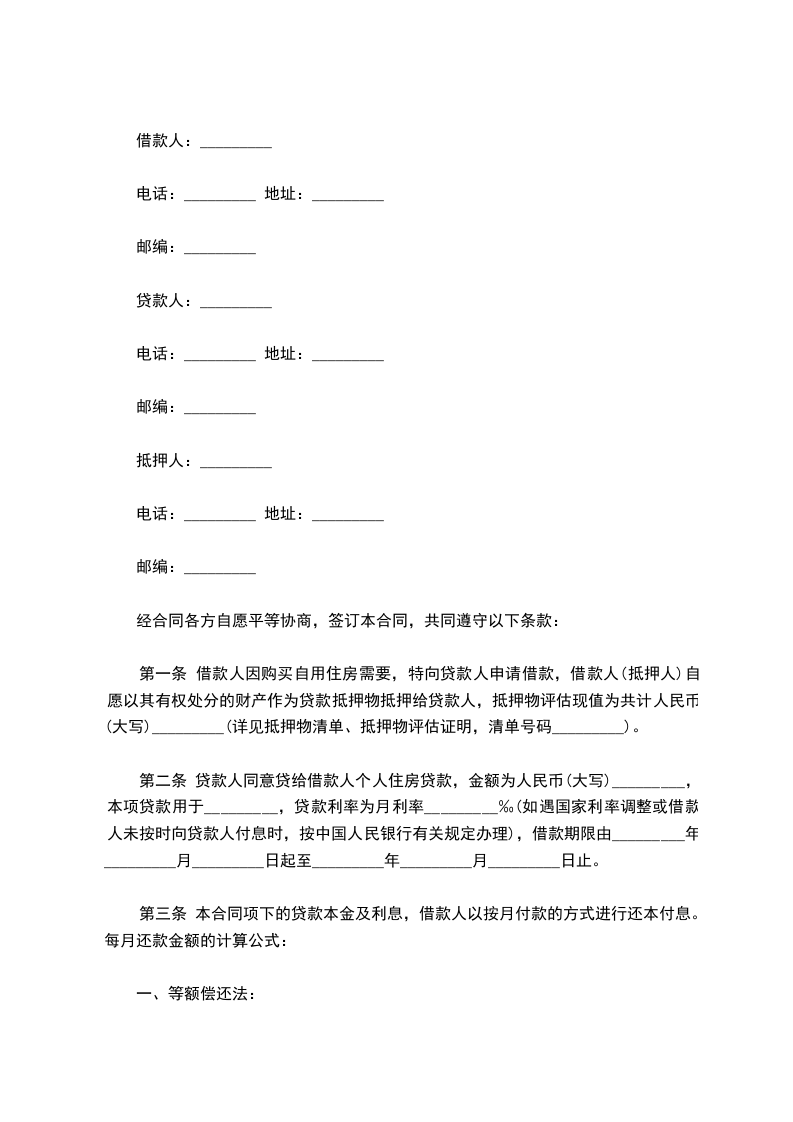 第二条 贷款人同意贷给借款人个人住房贷款,金额为人民币(大写)_________,本项贷款用于_________,贷款利率为月利率_________‰(如遇国家利率调整或借款人未按时向贷款人付息时,按中国人民银行有关规定办理),借款期限由_________年_________月_________日起至_________年_________月_________日止。