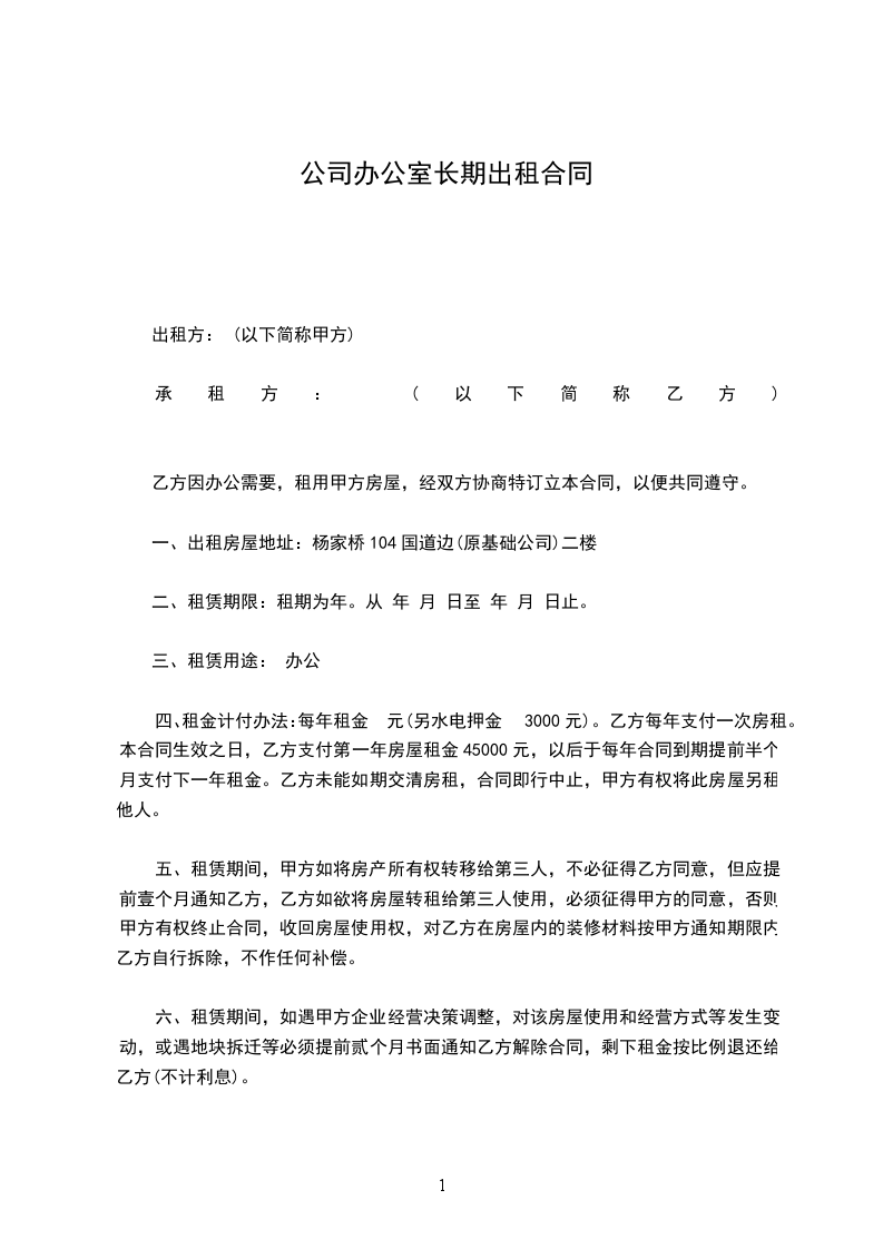 一、出租房屋地址:杨家桥104国道边(原基础公司)二楼