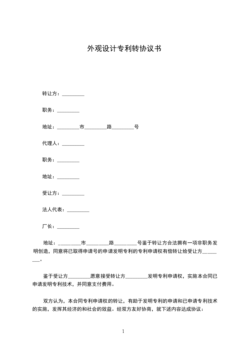 地址:_________市_________路_________号鉴于转让方合法拥有一项非职务发明创造,同意将已取得申请号的申请发明专利的专利申请权有偿转让给受让方_________。