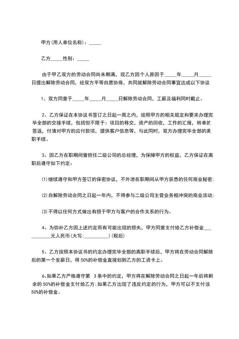 5、乙方承诺:离职后不泄露此协议的内容,保守甲方经营管理技术等方面的`任何秘密,不得以任何形式在任何场合从事任何损害甲方利益的活动,若违反,甲方将要求乙方赔偿损失并有权依法追究乙方相应的法律责任;