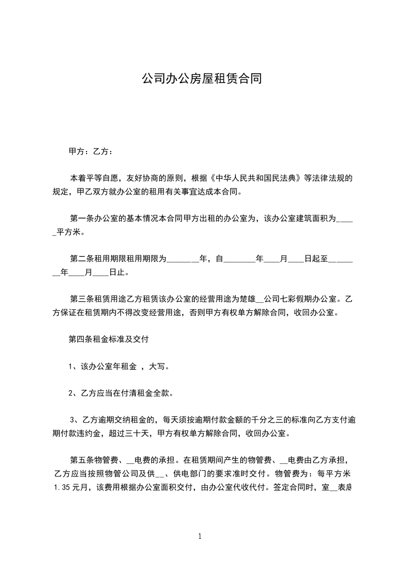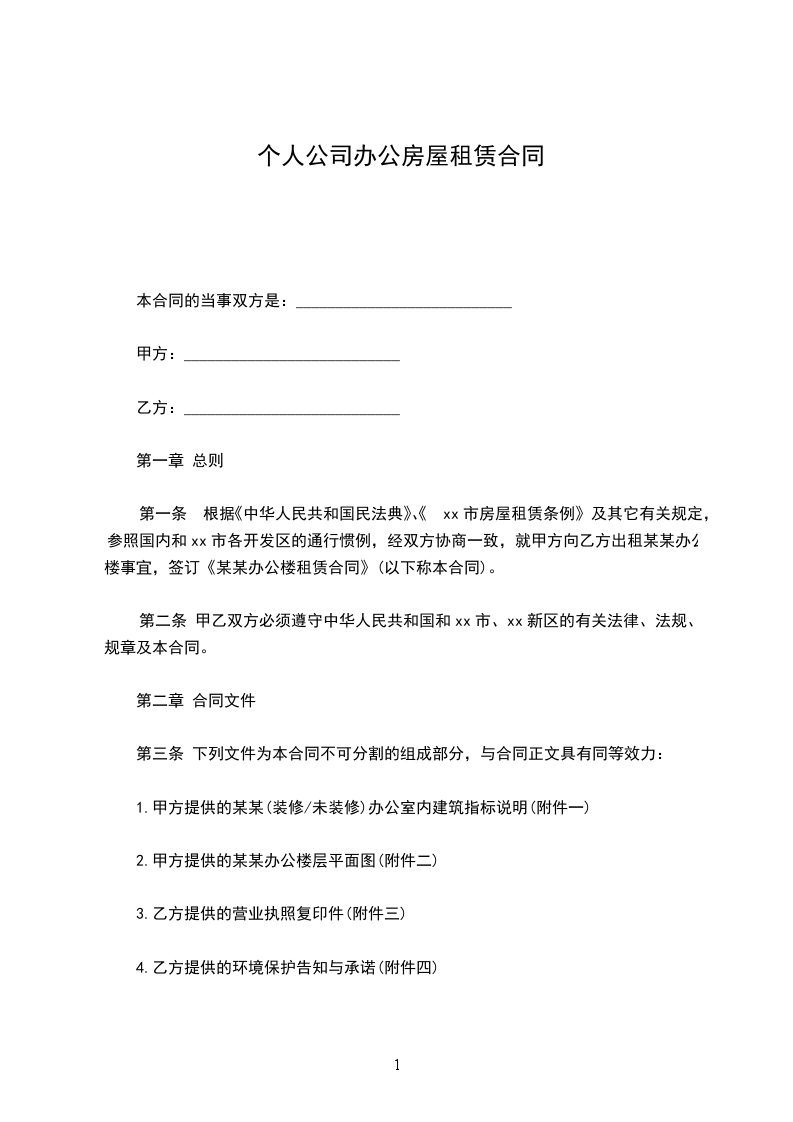第一条 根据《中华人民共和国民法典》、《xx市房屋租赁条例》及其它有关规定,参照国内和xx市各开发区的通行惯例,经双方协商一致,就甲方向乙方出租某某办公楼事宜,签订《某某办公楼租赁合同》(以下称本合同)。