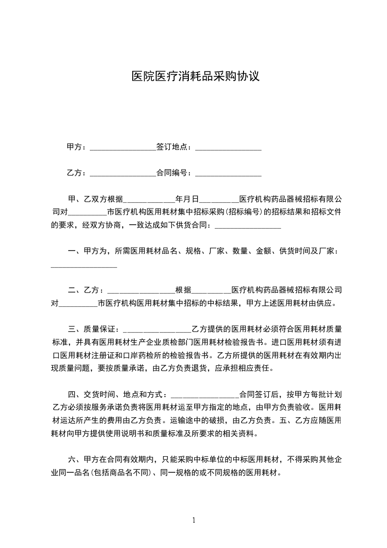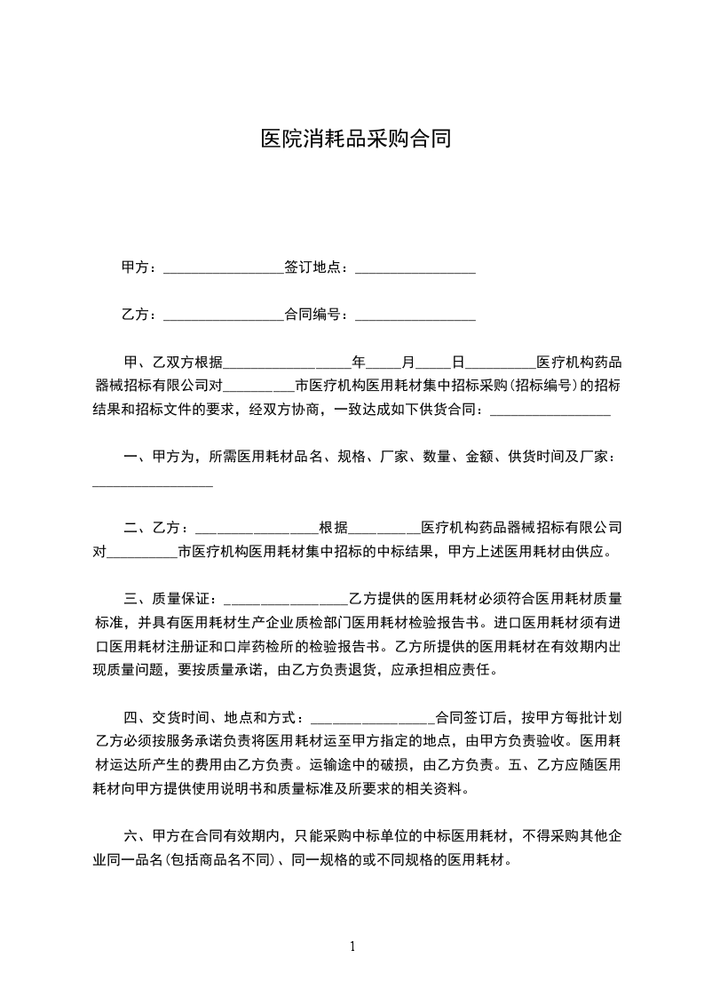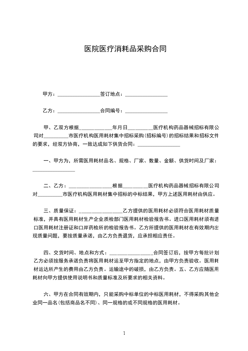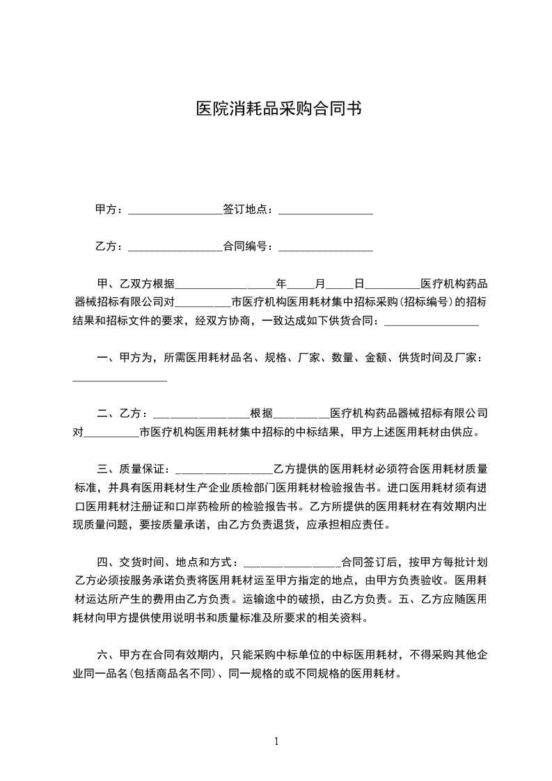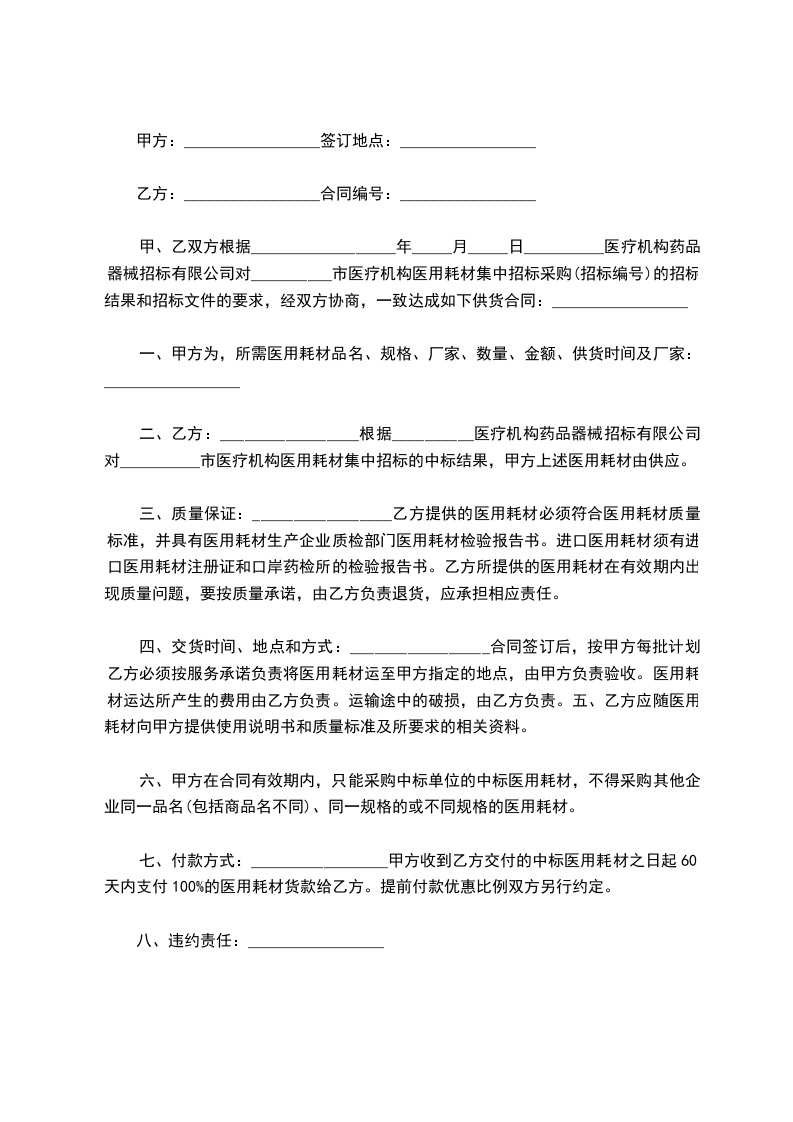 甲、乙双方根据__________________年_____月_____日__________医疗机构药品器械招标有限公司对__________市医疗机构医用耗材集中招标采购(招标编号)的招标结果和招标文件的要求,经双方协商,一致达成如下供货合同:_________________