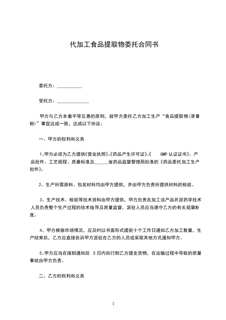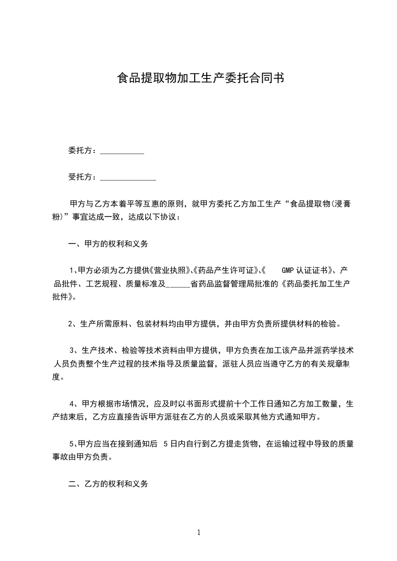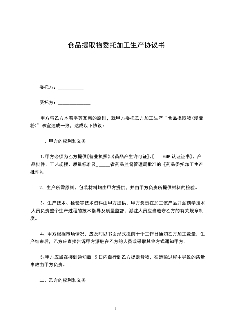 甲方与乙方本着平等互惠的原则,就甲方委托乙方加工生产“食品提取物(浸膏粉)”事宜达成一致,达成以下协议: