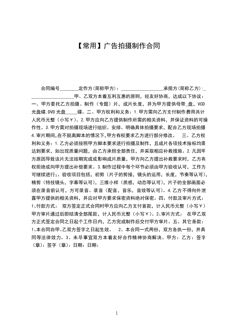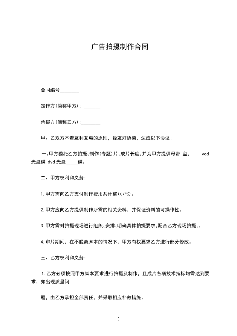 一、甲方委托乙方拍摄、制作 片,成片长度,并为甲方提供母带___________盘,vcd光盘碟,dvd光盘_____碟。