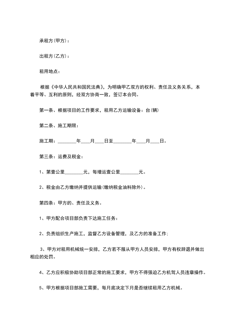 第一条、根据项目的工作要求,租用乙方运输设备:台(辆)