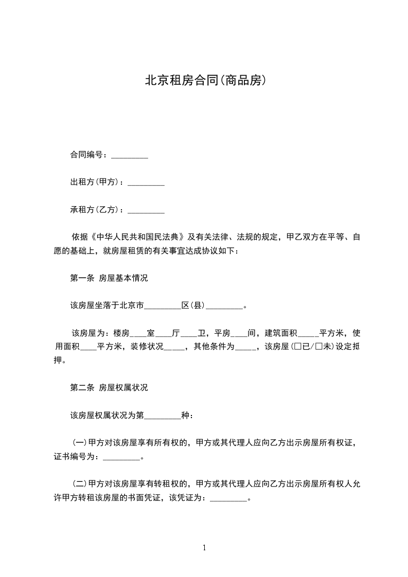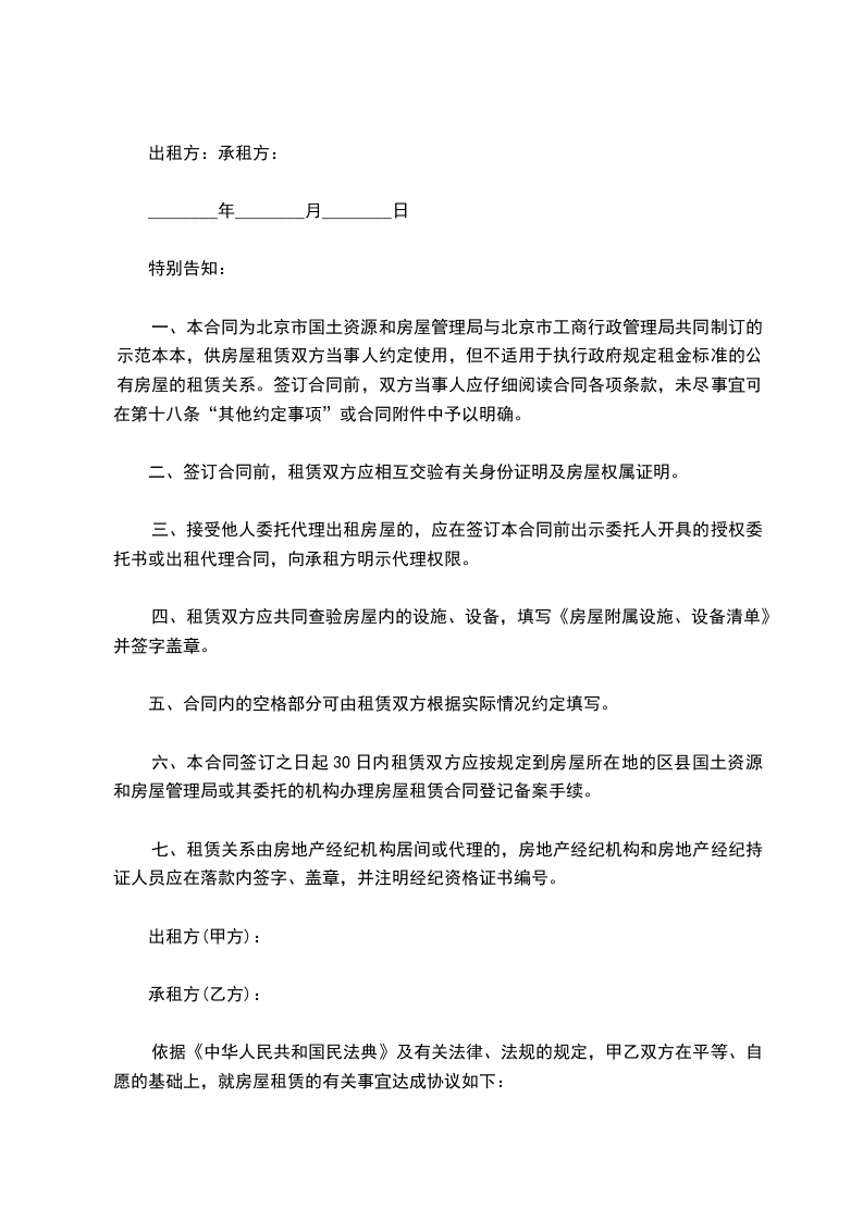 一、本合同为北京市国土资源和房屋管理局与北京市工商行政管理局共同制订的示范本本,供房屋租赁双方当事人约定使用,但不适用于执行政府规定租金标准的公有房屋的租赁关系。签订合同前,双方当事人应仔细阅读合同各项条款,未尽事宜可在第十八条“其他约定事项”或合同附件中予以明确。