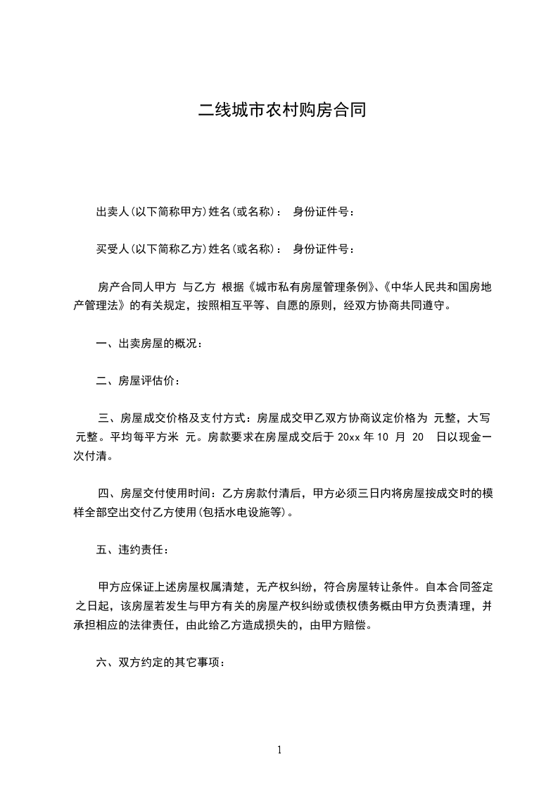 三、房屋成交价格及支付方式:房屋成交甲乙双方协商议定价格为 元整,大写 元整。平均每平方米 元。房款要求在房屋成交后于20xx年10 月 20 日以现金一次付清。