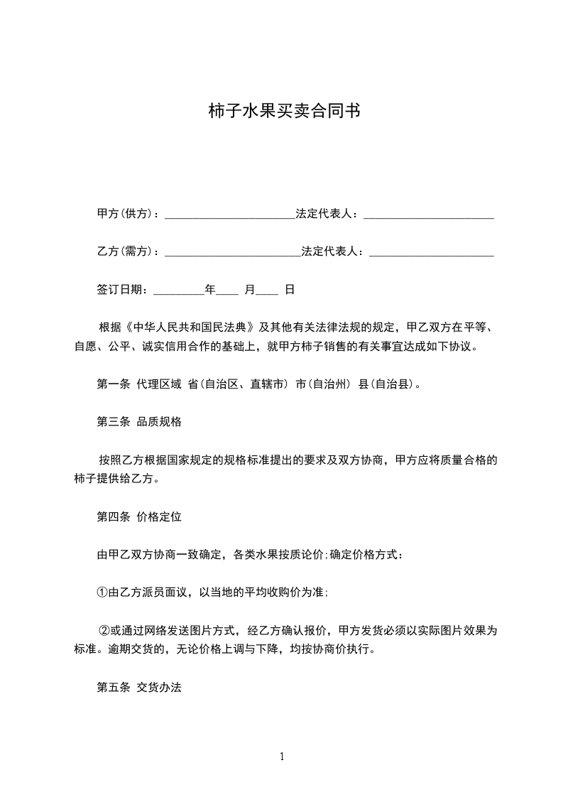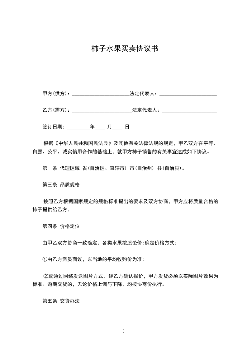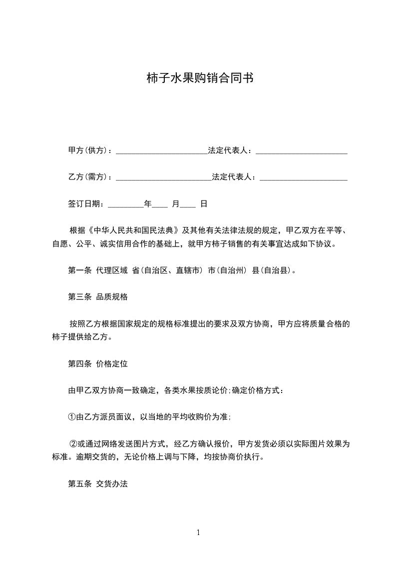 根据《中华人民共和国民法典》及其他有关法律法规的规定,甲乙双方在平等、自愿、公平、诚实信用合作的基础上,就甲方柿子销售的有关事宜达成如下协议。