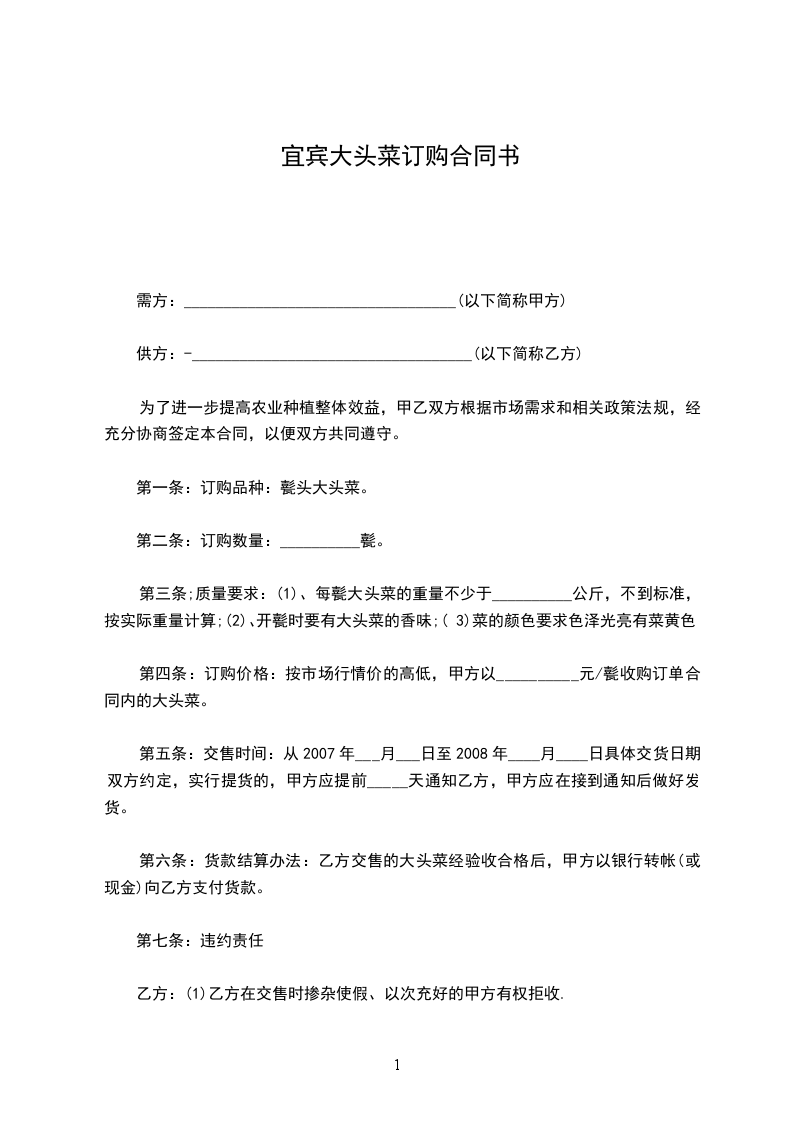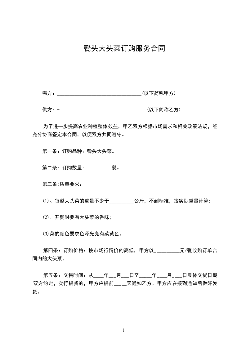 第四条:订购价格:按市场行情价的高低,甲方以__________元/甏收购订单合同内的大头菜。