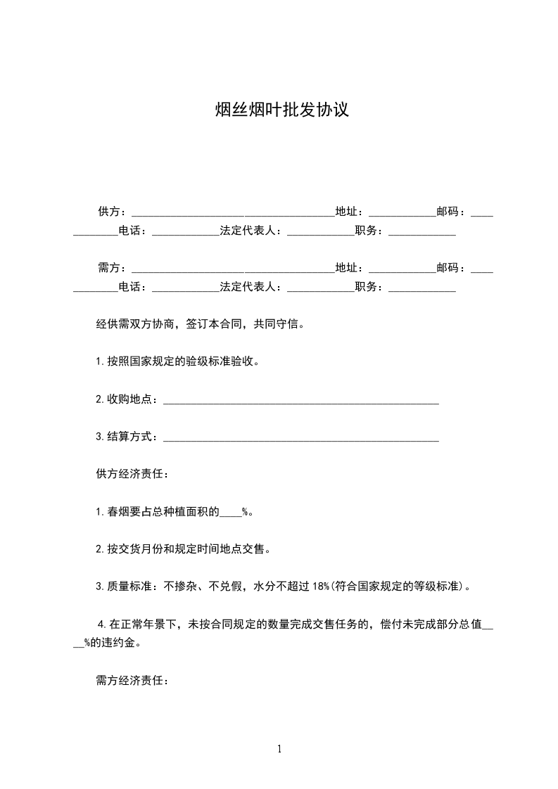 1.对交售的烟叶必须按国家规定的等级和价格标准按质论价,付给供方货款,不得压级压价;如有压级压价,除还足压价部分货款外,应按压价总值____%偿付违约金。
