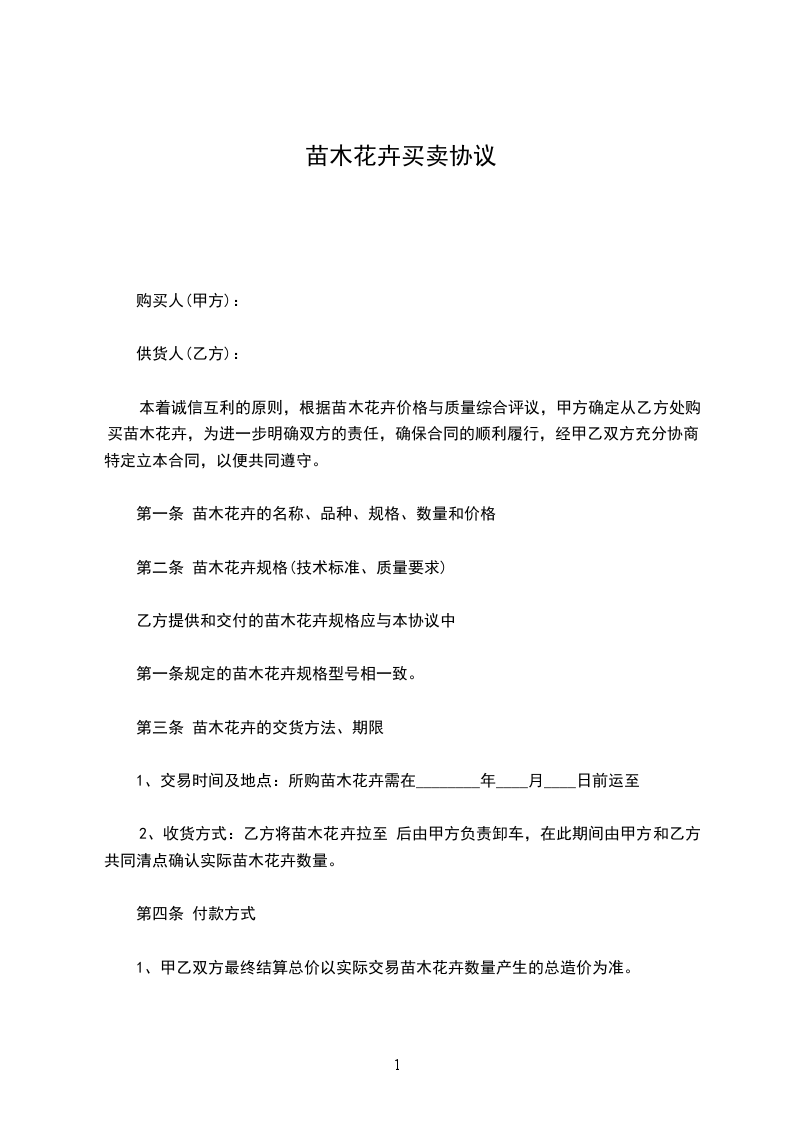 本着诚信互利的原则,根据苗木花卉价格与质量综合评议,甲方确定从乙方处购买苗木花卉,为进一步明确双方的责任,确保合同的顺利履行,经甲乙双方充分协商,特定立本合同,以便共同遵守。