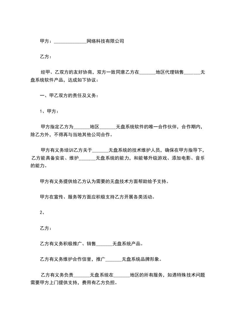 经甲、乙双方的友好协商,双方一致同意乙方在_______地区代理销售_______无盘系统软件产品,达成如下协议: