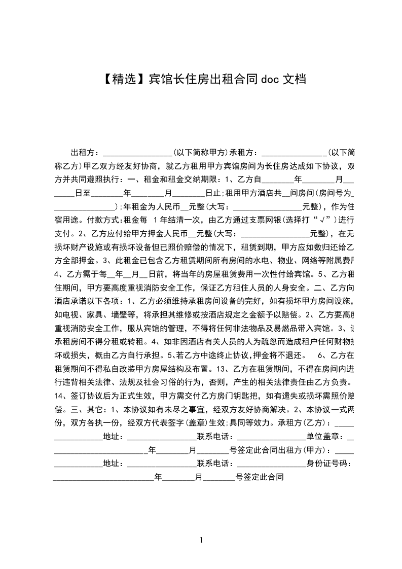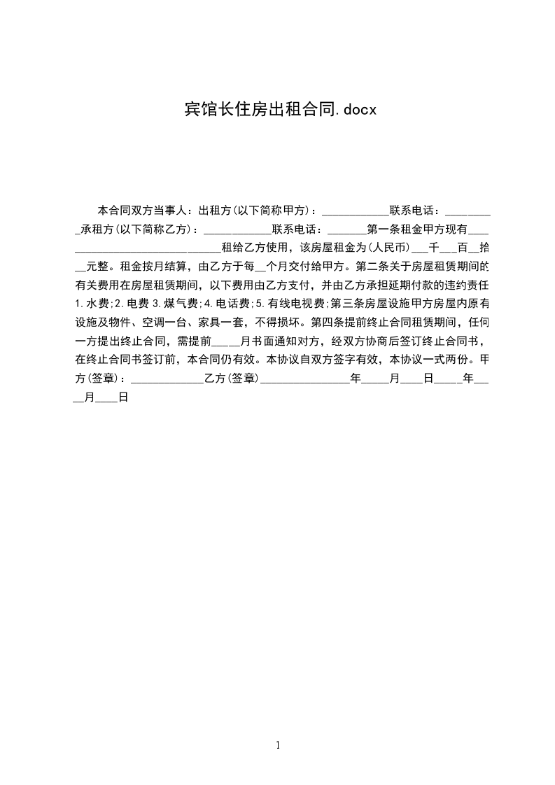 甲乙双方经友好协商,就乙方租用甲方宾馆房间为长住房达成如下协议,双方并共同遵照执行: