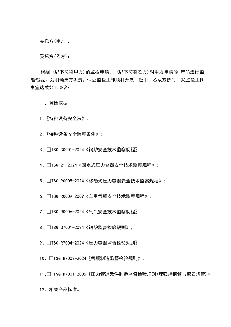 根据 (以下简称甲方)的监检申请, (以下简称乙方)对甲方申请的 产品进行监督检验。为明确双方职责,保证监检工作顺利开展,经甲、乙双方协商,就监检工作事宜达成如下协议:
