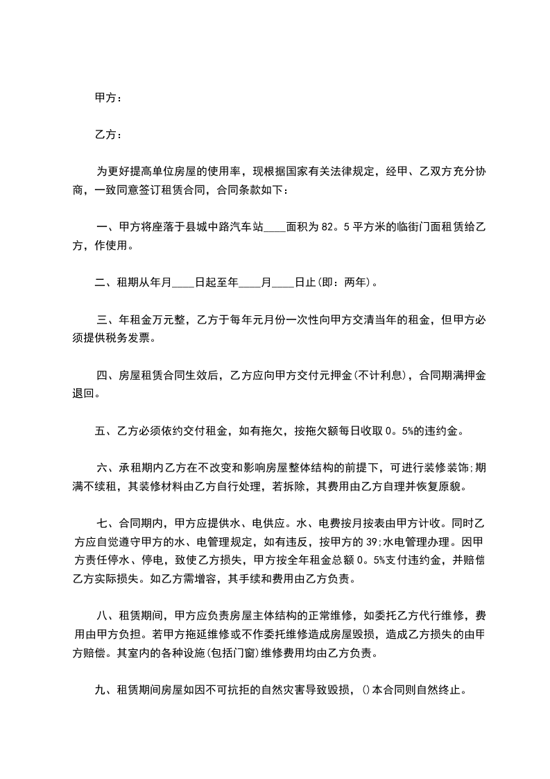 一、甲方将座落于县城中路汽车站____面积为82。5平方米的临街门面租赁给乙方,作使用。