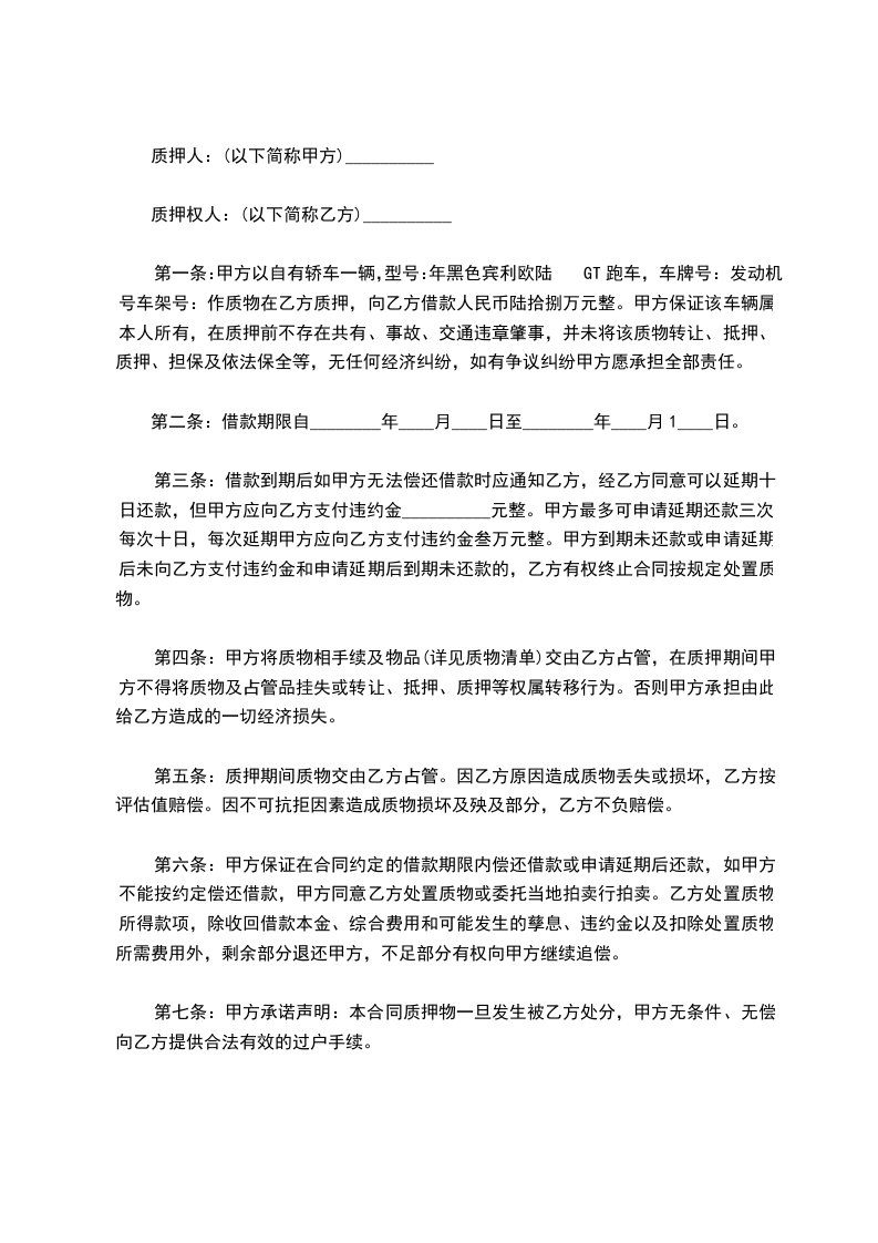 第一条:甲方以自有轿车一辆,型号:年黑色宾利欧陆GT跑车,车牌号:发动机号车架号:作质物在乙方质押,向乙方借款人民币陆拾捌万元整。甲方保证该车辆属本人所有,在质押前不存在共有、事故、交通违章肇事,并未将该质物转让、抵押、质押、担保及依法保全等,无任何经济纠纷,如有争议纠纷甲方愿承担全部责任。