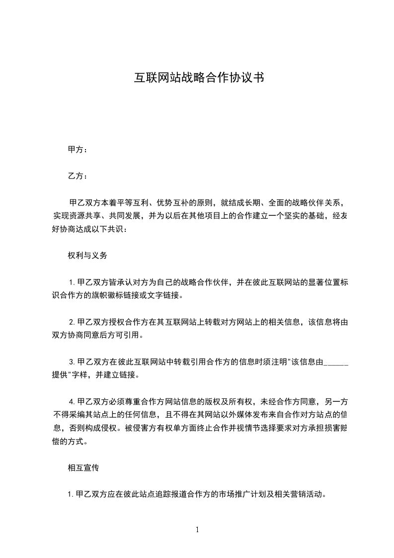 1. 甲乙双方皆承认对方为自己的战略合作伙伴,并在彼此互联网站的显著位置标识合作方的旗帜徽标链接或文字链接。