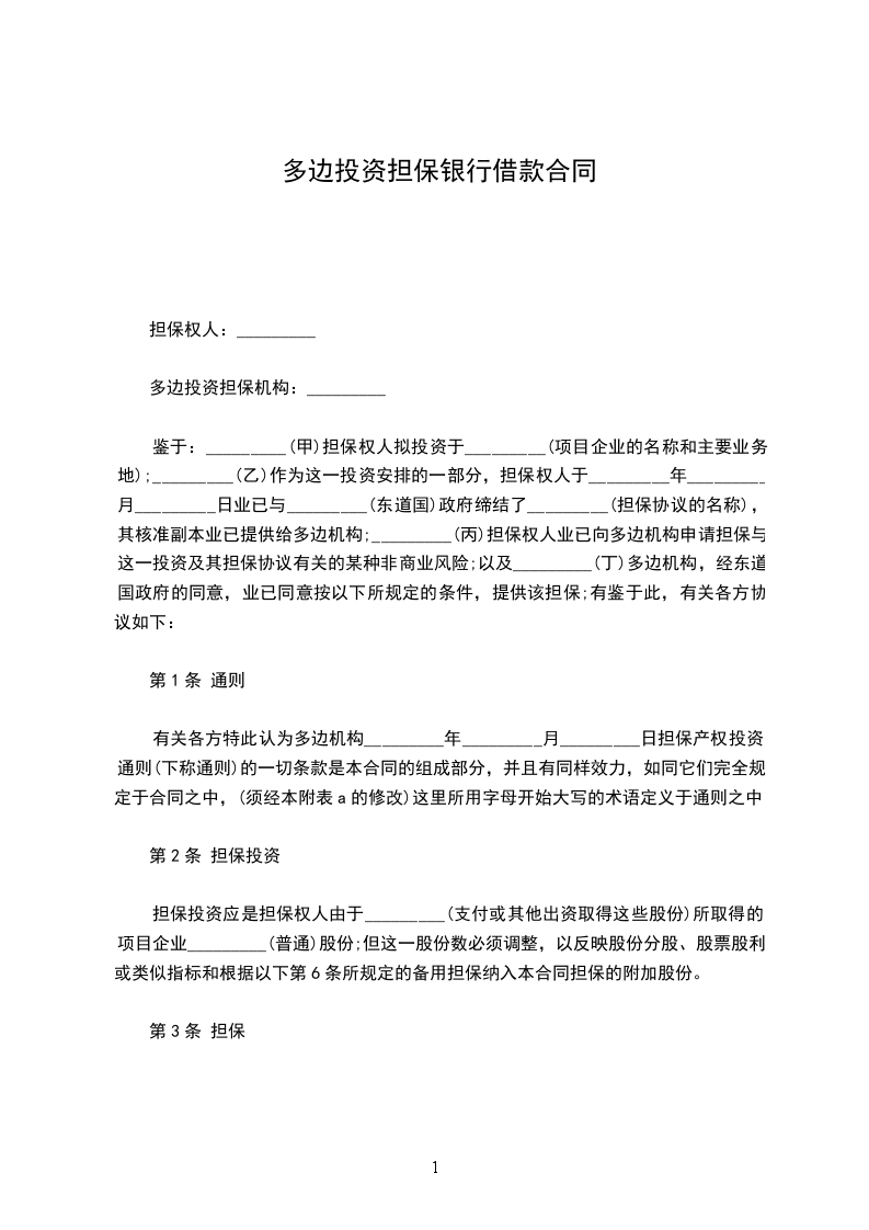 鉴于:_________(甲)担保权人拟投资于_________(项目企业的名称和主要业务地);_________(乙)作为这一投资安排的一部分,担保权人于_________年_________月_________日业已与_________(东道国)政府缔结了_________(担保协议的名称),其核准副本业已提供给多边机构;_________(丙)担保权人业已向多边机构申请担保与这一投资及其担保协议有关的某种非商业风险;以及_________(丁)多边机构,经东道国政府的同意,业已同意按以下所规定的条件,提供该担保;有鉴于此,有关各方协议如下: