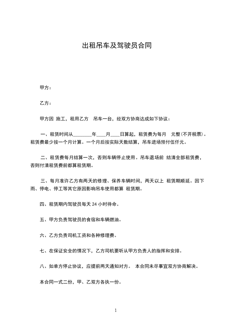 一、租赁时间从________年____月____日算起,租赁费为每月 元整(不开税票)。租赁费最少按一个月计算。一个月后按实际天数结算,吊车进场预付伍仟元。