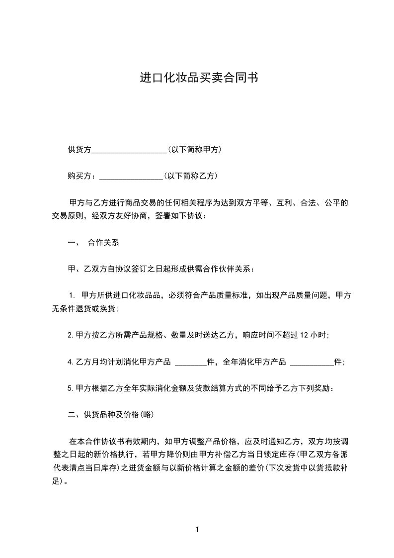 1. 甲方所供进口化妆品品,必须符合产品质量标准,如出现产品质量问题,甲方无条件退货或换货;