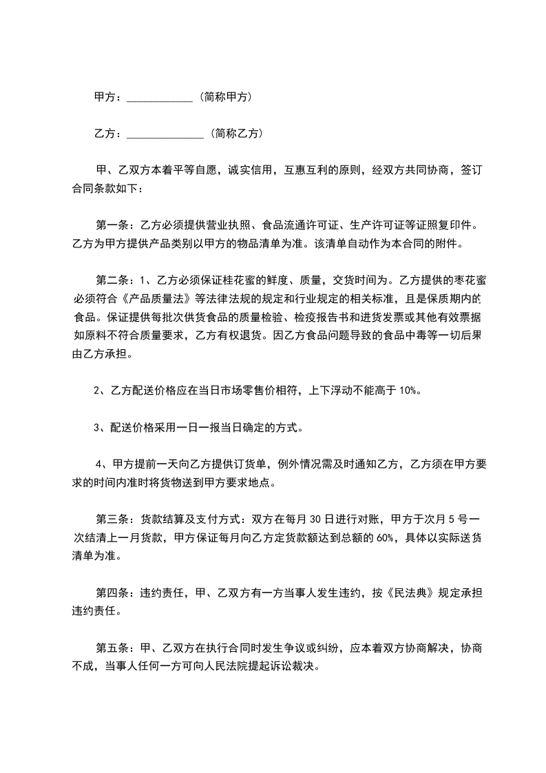 第二条:1、乙方必须保证枣花蜜的鲜度、质量,交货时间为。乙方提供的枣花蜜必须符合《产品质量法》等法律法规的规定和行业规定的相关标准,且是保质期内的食品。保证提供每批次供货食品的质量检验、检疫报告书和进货发票或其他有效票据。如原料不符合质量要求,乙方有权退货。因乙方食品问题导致的食品中毒等一切后果由乙方承担。