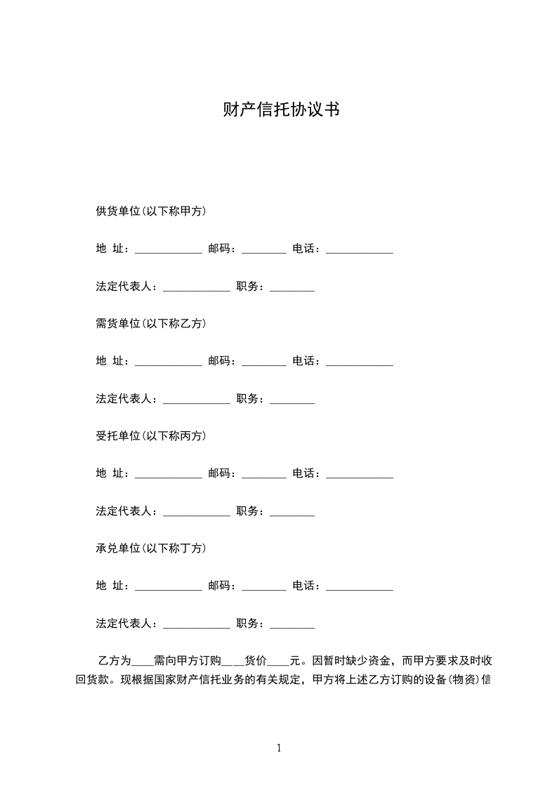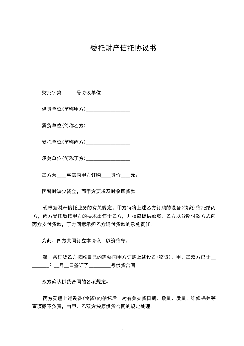 第一条甲方将准备出售给_____单位的设备(物资),向丙方提出财产信托,并要求丙方在购货单位延期付款期间提供融资。