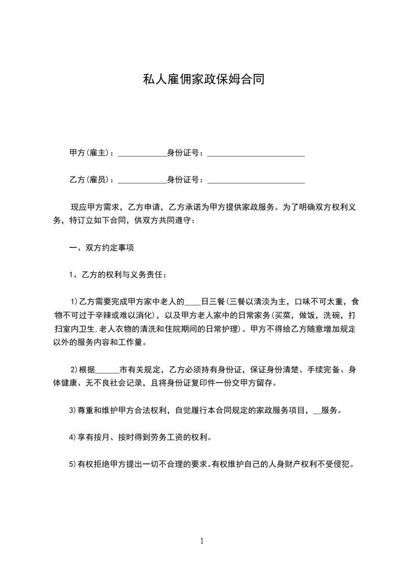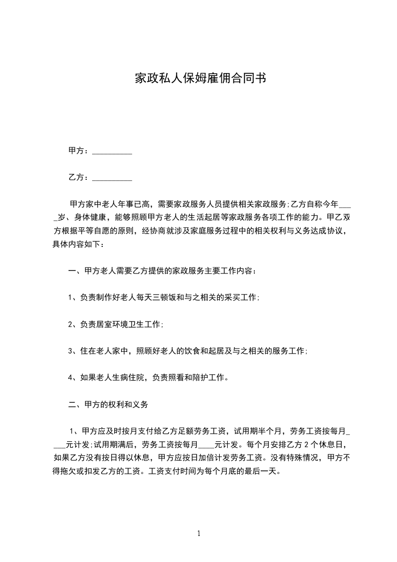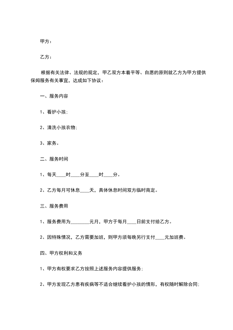 一、甲方聘请乙方为私家保姆,主要从事甲方孩子(______)看护工作,双方应以诚相待,相互说明有关必要信息,不得做假欺骗。